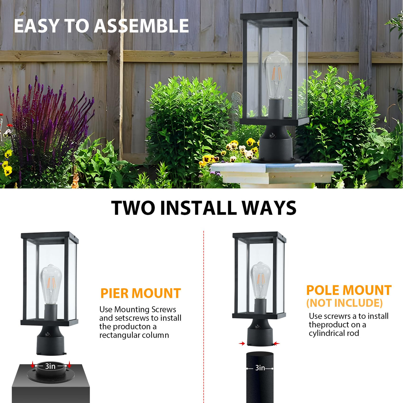 Q: What are the installation options for the Hulitnag Dusk to Dawn Outdoor Post Lights?A: The Hulitnag Dusk to Dawn Outdoor Post Lights can be installed on a 3-inch pole (sold separately) for flexible height adjustments, or base-mounted directly on the ground with a 3-inch x 3-inch base, making it ideal for fixed locations like gardens and courtyards.