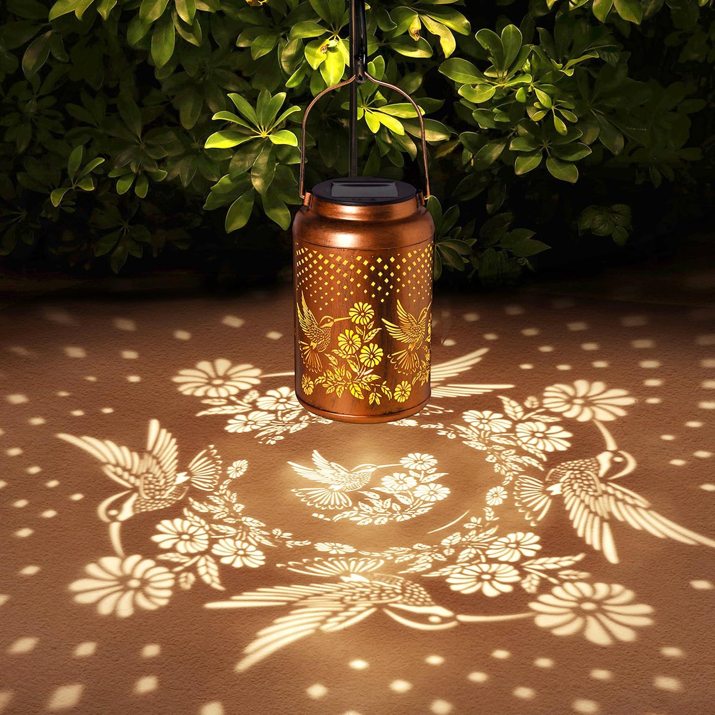 Q: What are the key features of the Hummingbird Solar Lantern?A: The Hummingbird Solar Lantern features an elegant vintage design with a golden copper color and a hollow metal finish. It emits bright and warm light, showcasing a beautiful hummingbird pattern that enhances outdoor ambiance. Additionally, it is equipped with high-efficiency solar panels for stable performance and has an IP65 waterproof rating, making it durable for outdoor use.