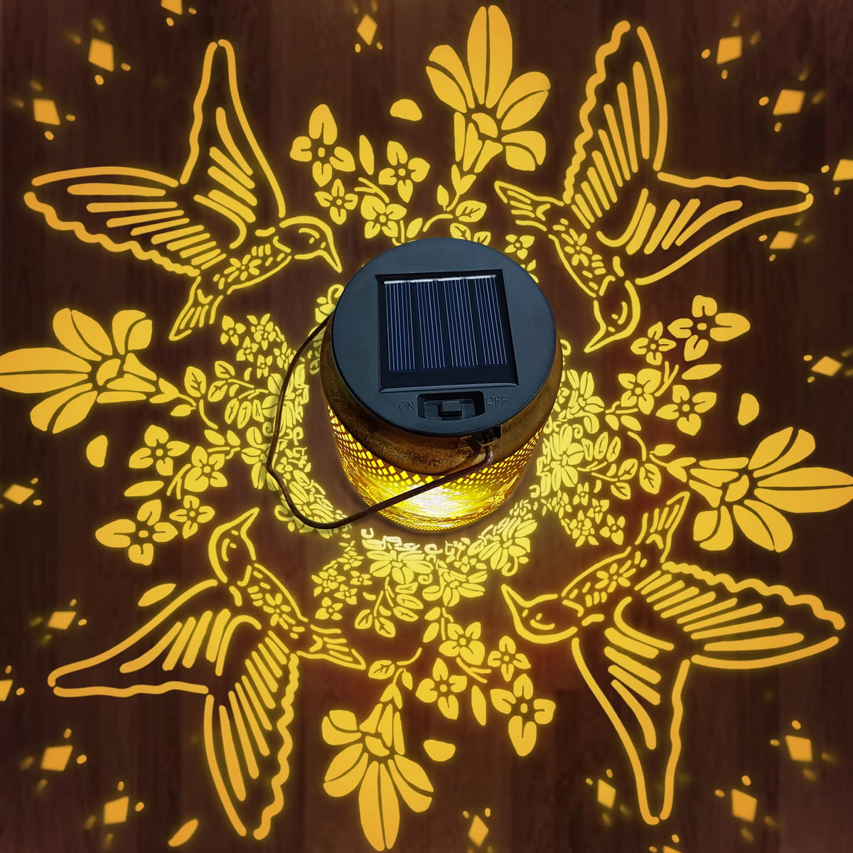 Q: What type of material is the Hummingbird Solar Lantern made from?A: The Hummingbird Solar Lantern is crafted from high-quality, rust-resistant metal, ensuring durability and longevity. Its intricate hollow design enhances its aesthetic appeal while providing functional outdoor lighting.