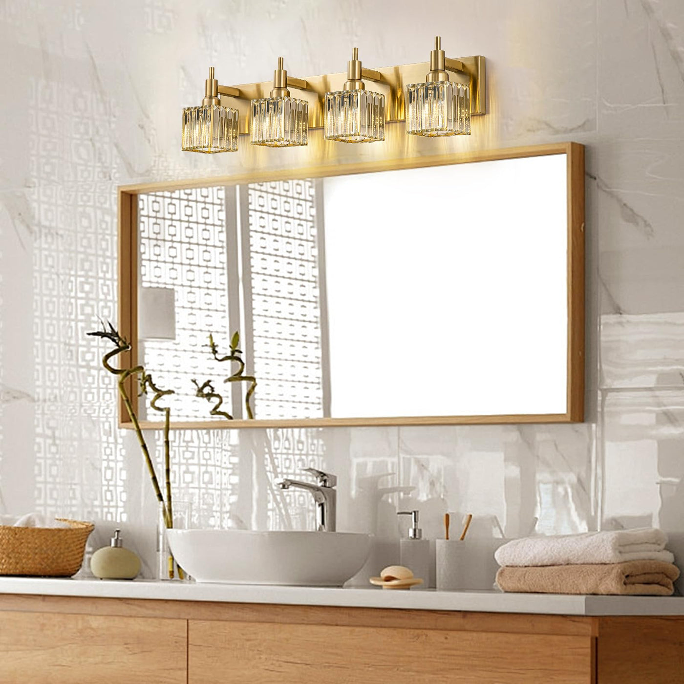 Huoku Gold Bathroom Vanity Lights, 4 Lights Crystal Bathroom Lighting Fixtures Over Mirror Modern Gold Crystal Bathroom Wall Lig
