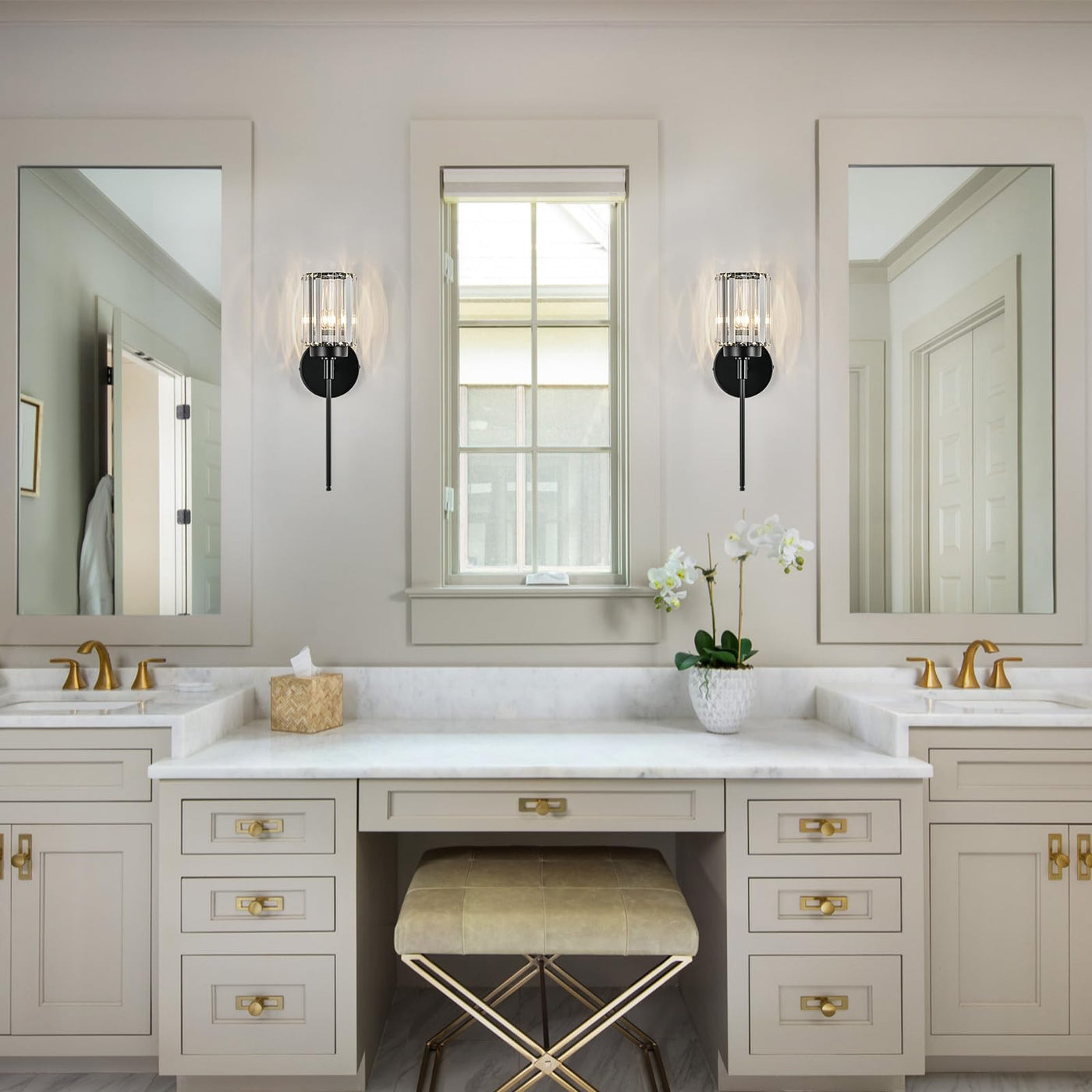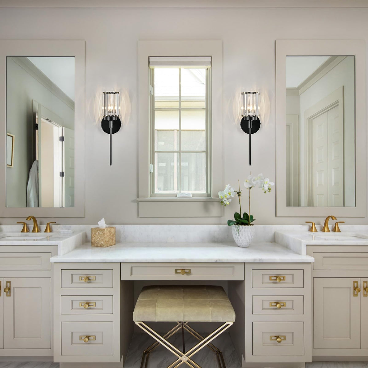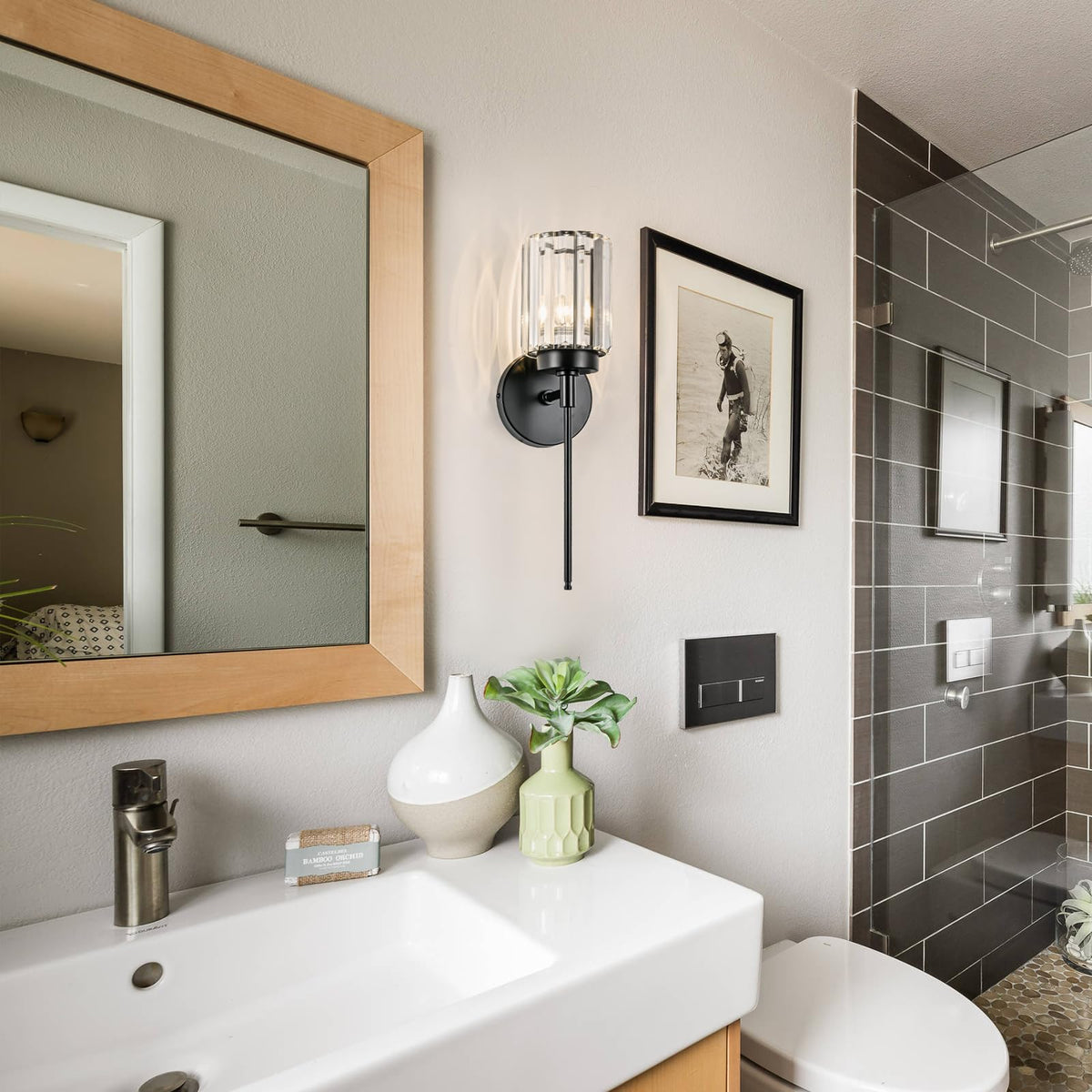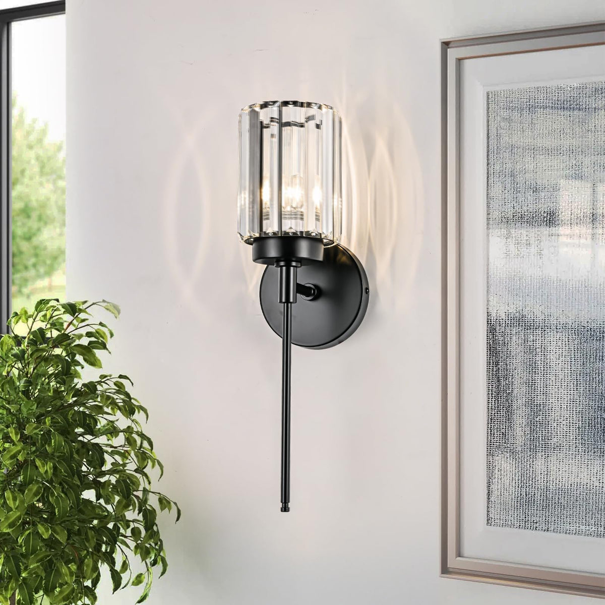HUOKU Modern Crystal Bathroom Vanity Lights, Black 1-Lights Bathroom Light Fixtures Over Mirror, Single Crystal Wall Lighting for Hallway