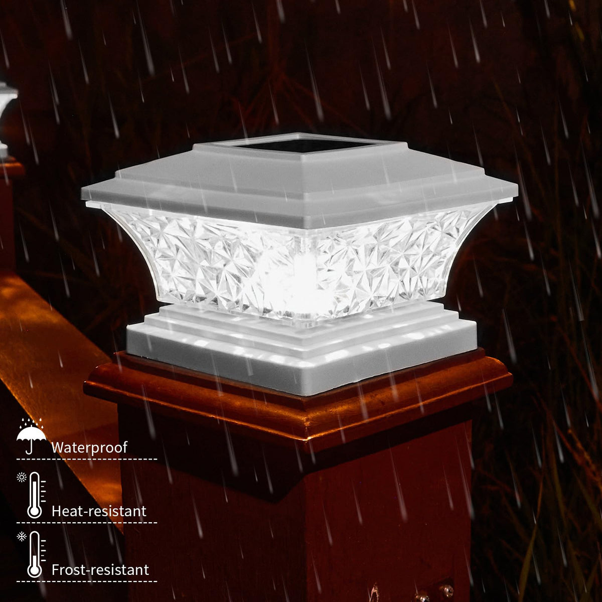 TWO LIGHTING CHOICE: solar post light outdoor has two modes (Bright white & color-cycling). PLS MAKE SURE YOU TURN THEM INTO SAME MODE TO UNIFY THE LED COLOR. | FLEXIBLE - Fits 4 x 4 inch vinyl posts. No need to run electrical wiring. Completely self-contained. | BEAUTY BY DESIGN - Extra brightness and modern lined design make your home unique and warm. | WEATHER PROOF: Solar fence post light has an IP44 waterproof rating. It will withstand harsh heat, heavy downpour, and snow or any other outdoor environments. | SATISFACTION GUARANTEE--Pls contact us if lacking accessories or you get any defective products