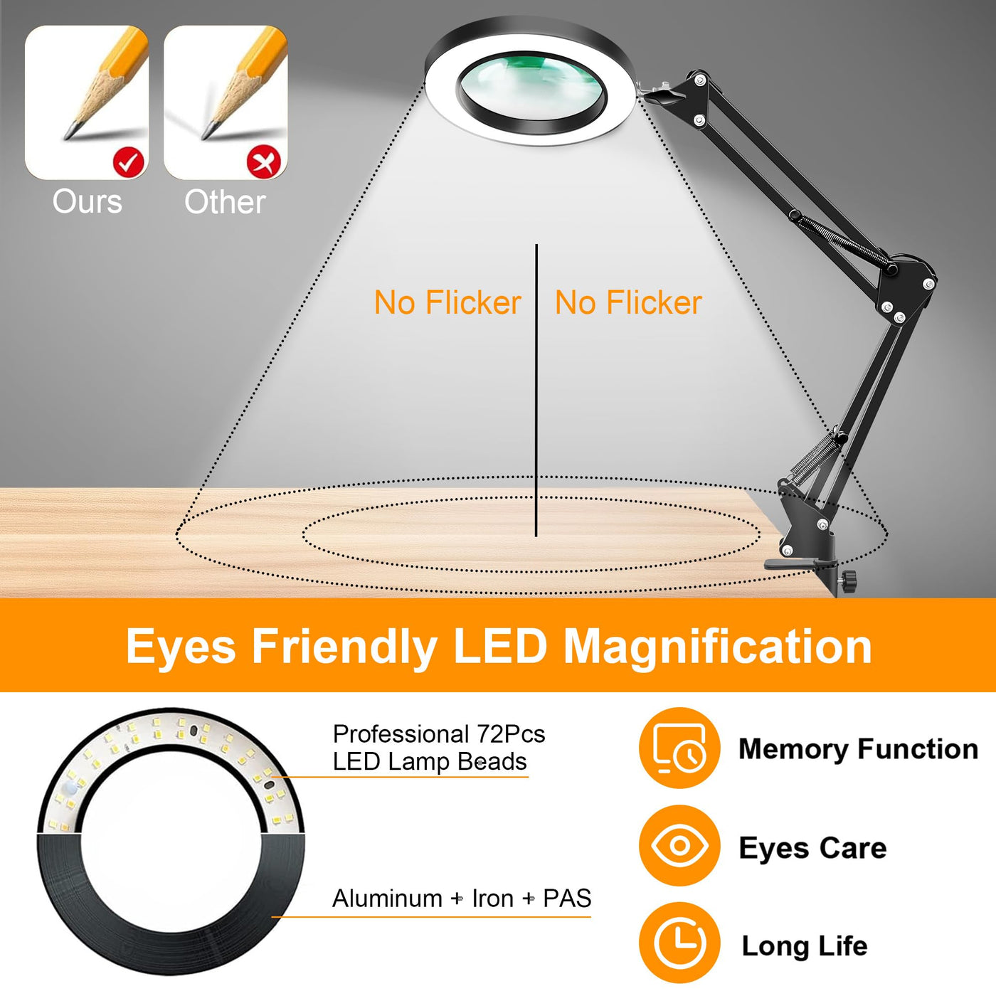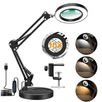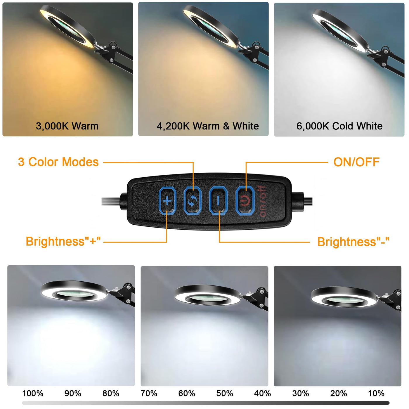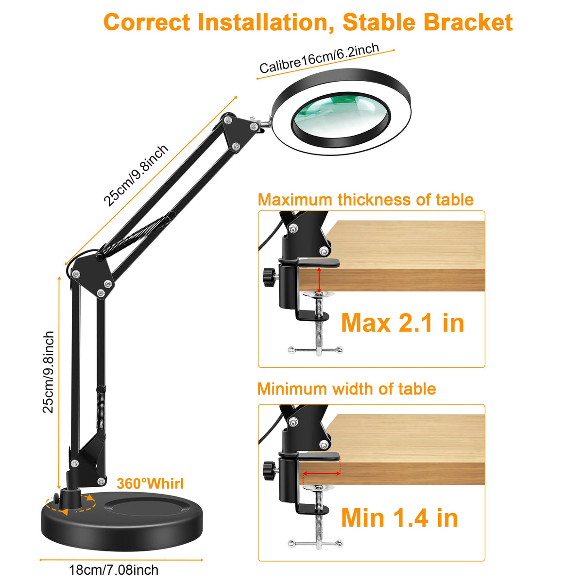 Features: Desktop Led Light And Magnifying Glass, Magnifying Glass With Led Light, Providing Enough Light For You At Night Without Switching On The Ceiling Lights. Metal Lamp Holder, Fast Heat Dissipation, No Danger, No Flash. The Lights Are Free Of Ghosting, Soft And Uniform, And Protect The Eyes. The Lamp Can Be Rotated 360 , The Bracket Can Be Adjusted 180 . Usb Interface Power Supply, Compatible With A Variety Of Power Supply Methods: Computer, Adapter, Power Bank, Etc. The Lamp Magnifier With 10X Magnification Can Be Used In Offices, Schools, Laboratories, Desks, Bedrooms, Etc. It Is More Careful And Convenient For Studying And Working. Specifications: Type: Magnifying Lamp Magnification: 10X Colour: Black Material: Metal + Plastic+Glass Power Mode: Usb Light Source: Led Switching Mode: Button Switch Dimming Method: 10 Gears Colour Temperature: 3000K, 4200K, 6000K Length Of Power Cord: Approx. 114Cm/44.9In Lamp Diameter: Approx. 16Cm/ 6.2In Packing List: 1* Weighted Base 1* Clamp 1* Real Glass Lens 1* Swing Arms
