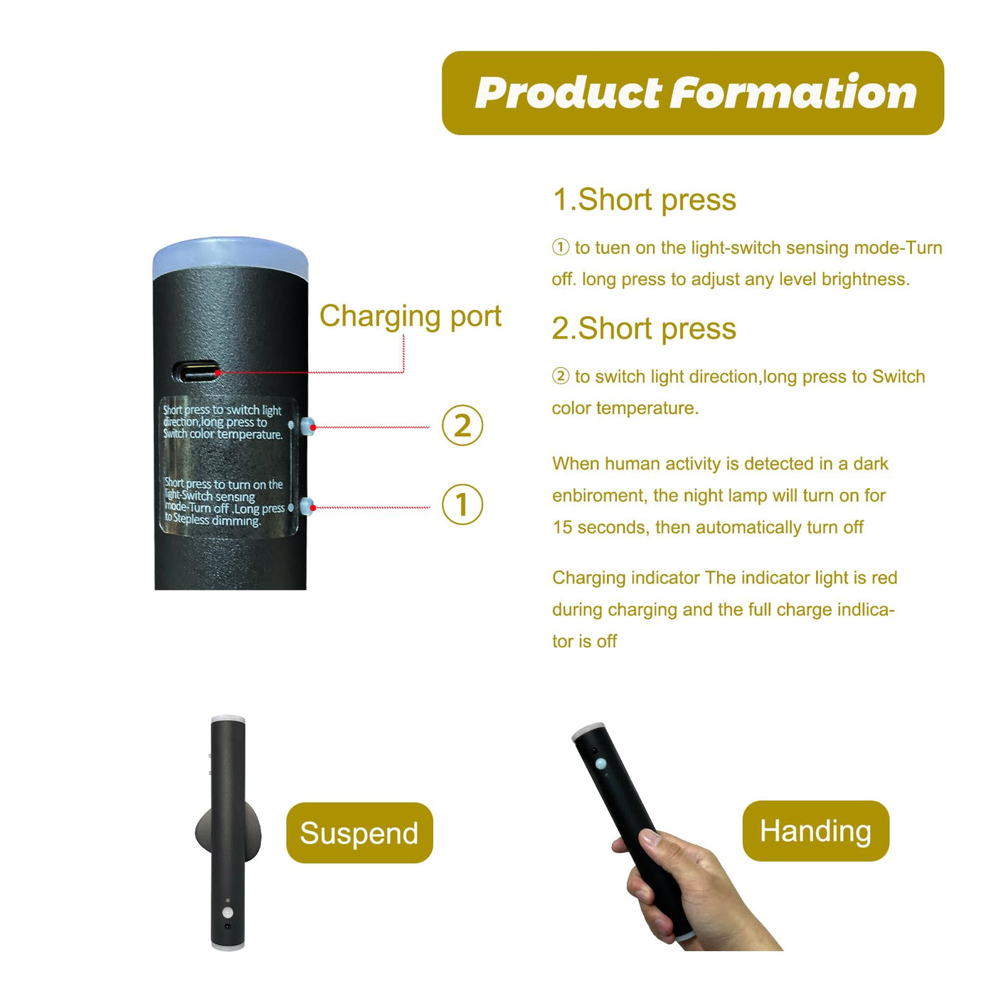 Q: How long does the battery last on a single charge?A: This night light is equipped with a built-in 2000mAh rechargeable battery, providing 12-15 hours of continuous light in constant mode and lasting up to 7-8 months in sensor mode.