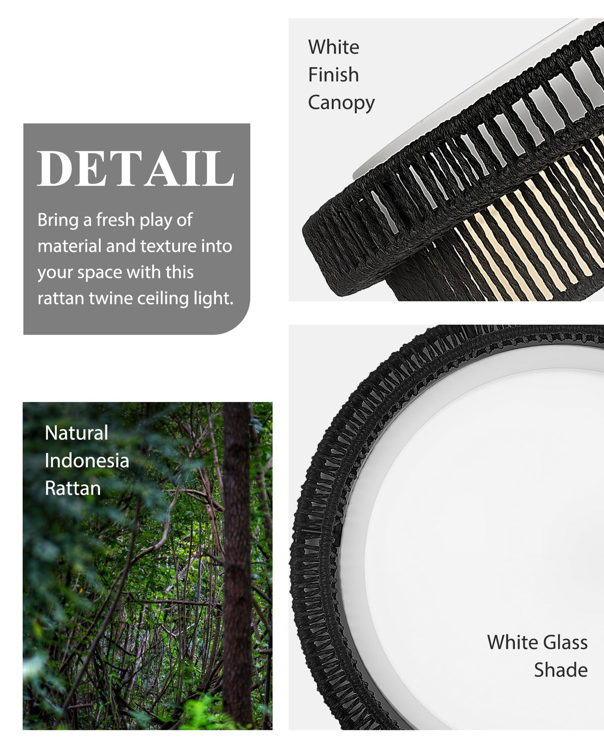 Q: What materials are used in the construction of this ceiling light?A: The ceiling light is made of 100% hand-woven natural rattan twine in black color, mounted on a sturdy metal frame, and features a frosted white glass lampshade.