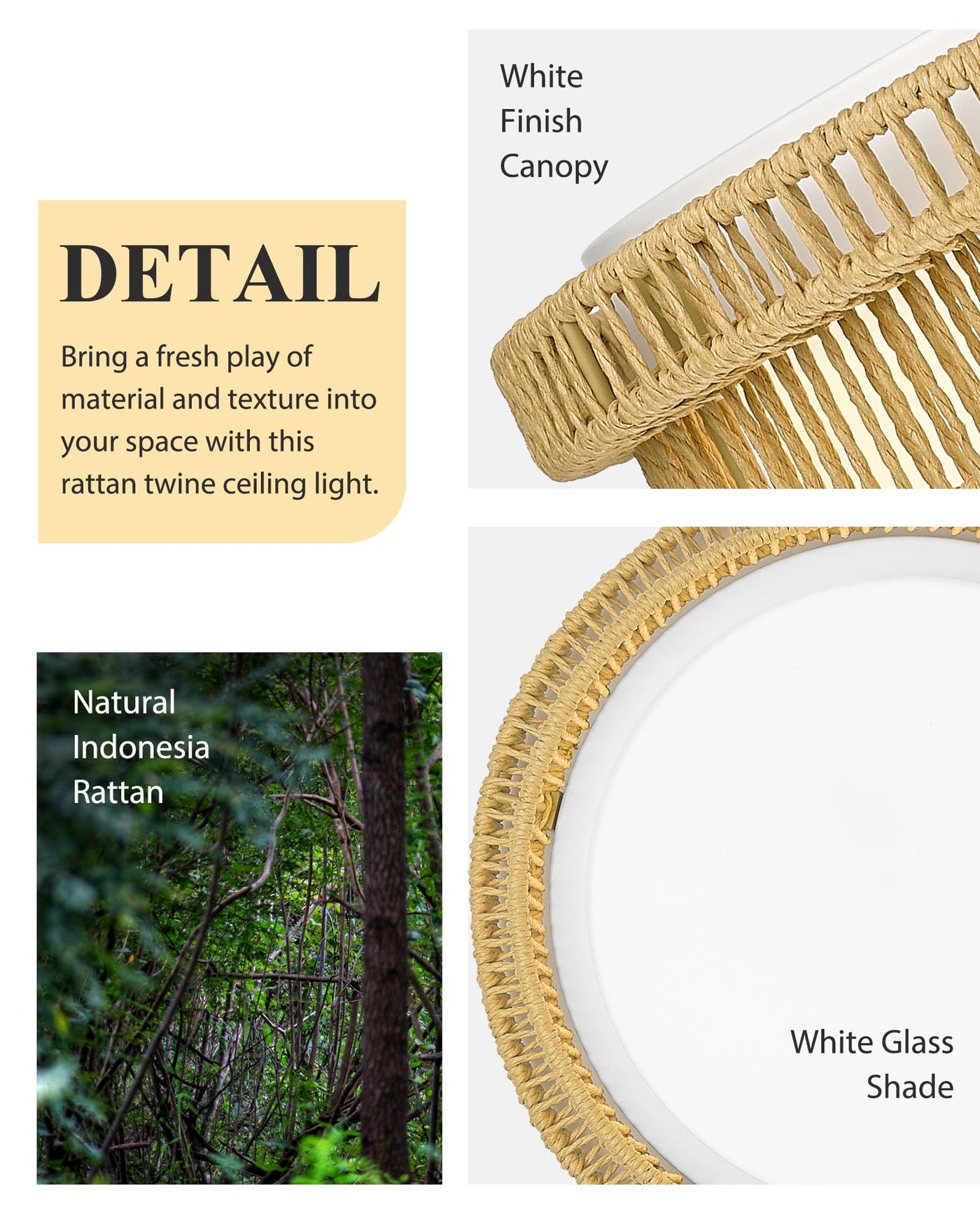 Crafted from 100% hand-woven natural rattan twine in a soft beige color, this flush mount ceiling light is both aesthetically pleasing and functional. The sturdy metal frame supports an energy-efficient LED module, which is enclosed within a frosted white glass lampshade. This design creates a soft, flicker-free glow that is easy on the eyes, providing a warm and inviting atmosphere to any room.