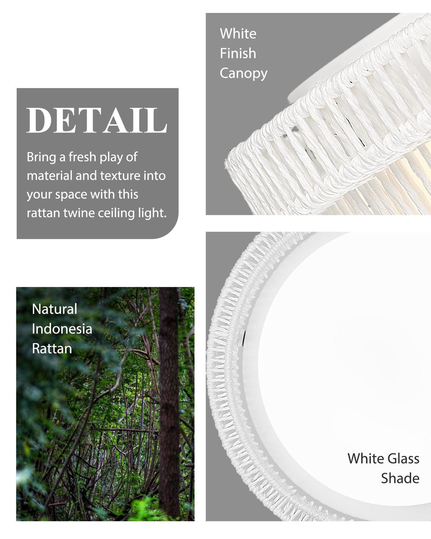 Q: What materials are used in the construction of this ceiling light?A: This ceiling light is made from 100% hand-woven natural rattan twine in white color, combined with a sturdy metal frame and a frosted white glass lampshade.