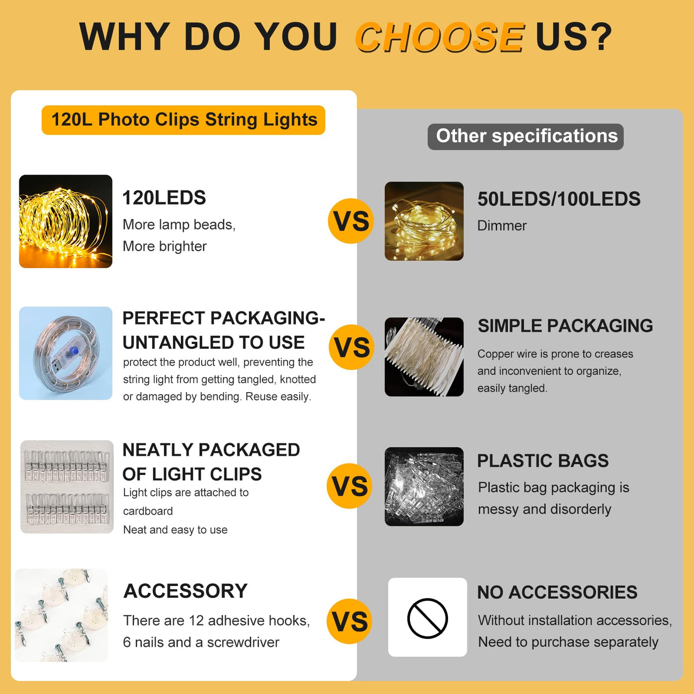 HXWEIYE 120LEDs Photo Clips String Light, Warm White 40Ft Fairy Light with 52 Clear Clips & 12 Hooks on Wall, Timer & 8 Modes US