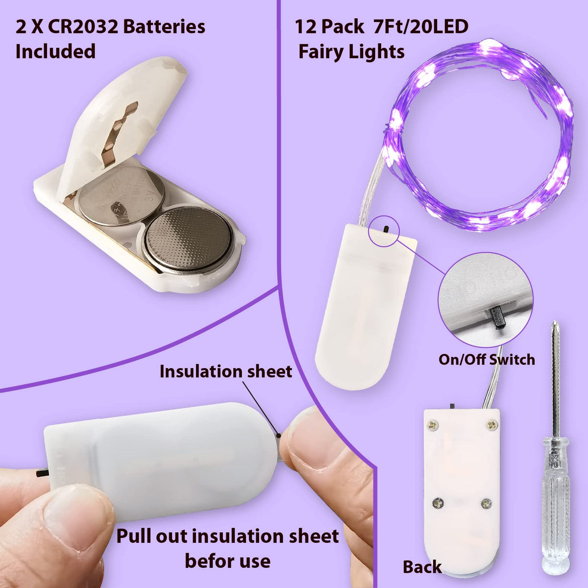 HXWEIYE LED Fairy Lights 12 Pack, 7ft 20LED Waterproof Purple Mini String Lights for Mason Jars, Model HY100150-20-purple