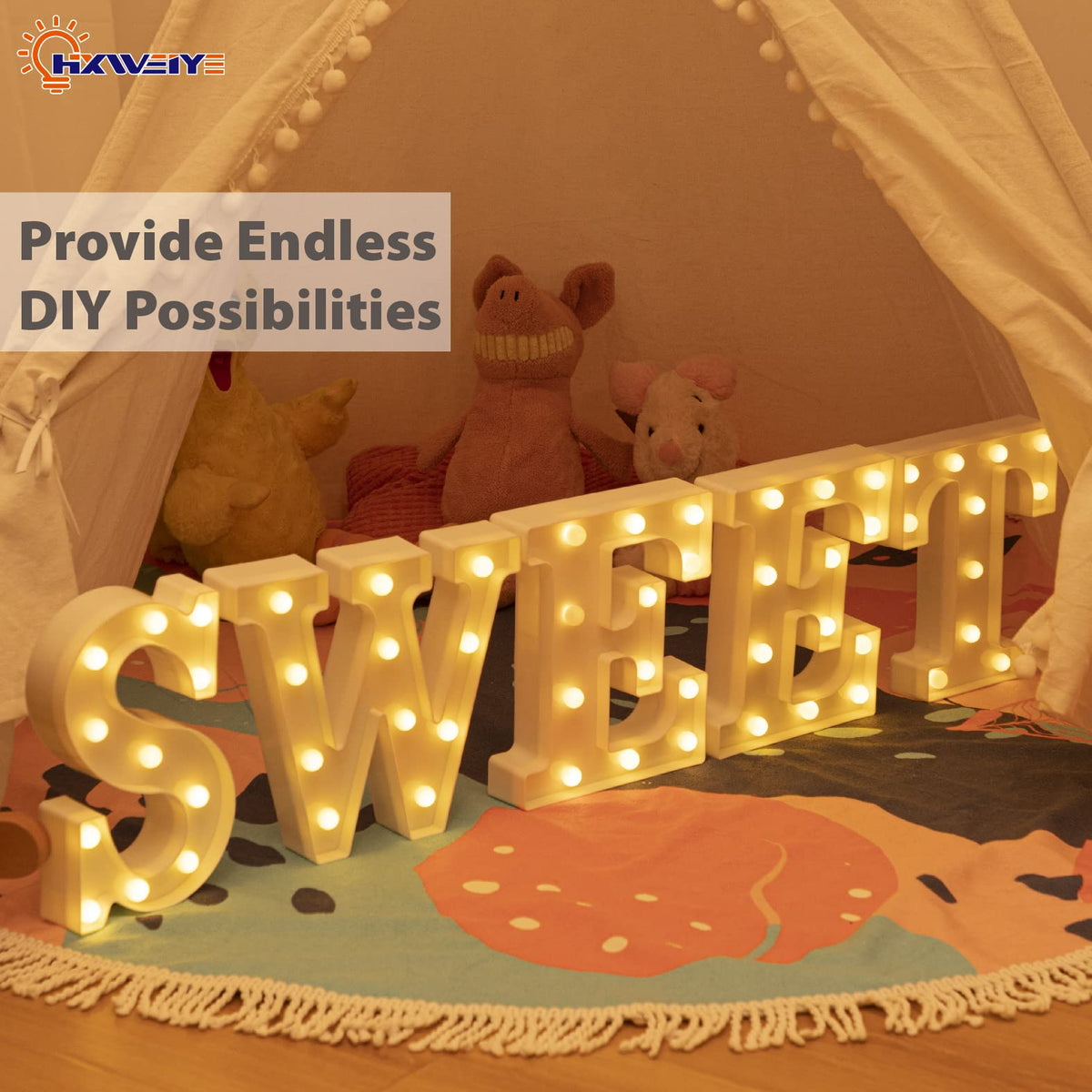 Q: What color are the lights in the HXWEIYE Light Up Letters?A: The lights emit a warm white glow, which adds a cozy and inviting ambiance to any setting.