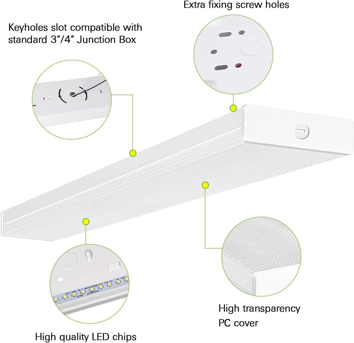 Q: What is the light output and color temperature of the Hykolity LED Wraparound Light?A: The Hykolity 4FT LED Wraparound Light provides over 4400 lumens of brightness with a color temperature of 4000K, which emits a neutral white light ideal for various settings.