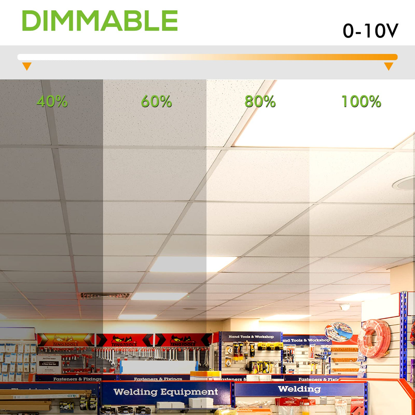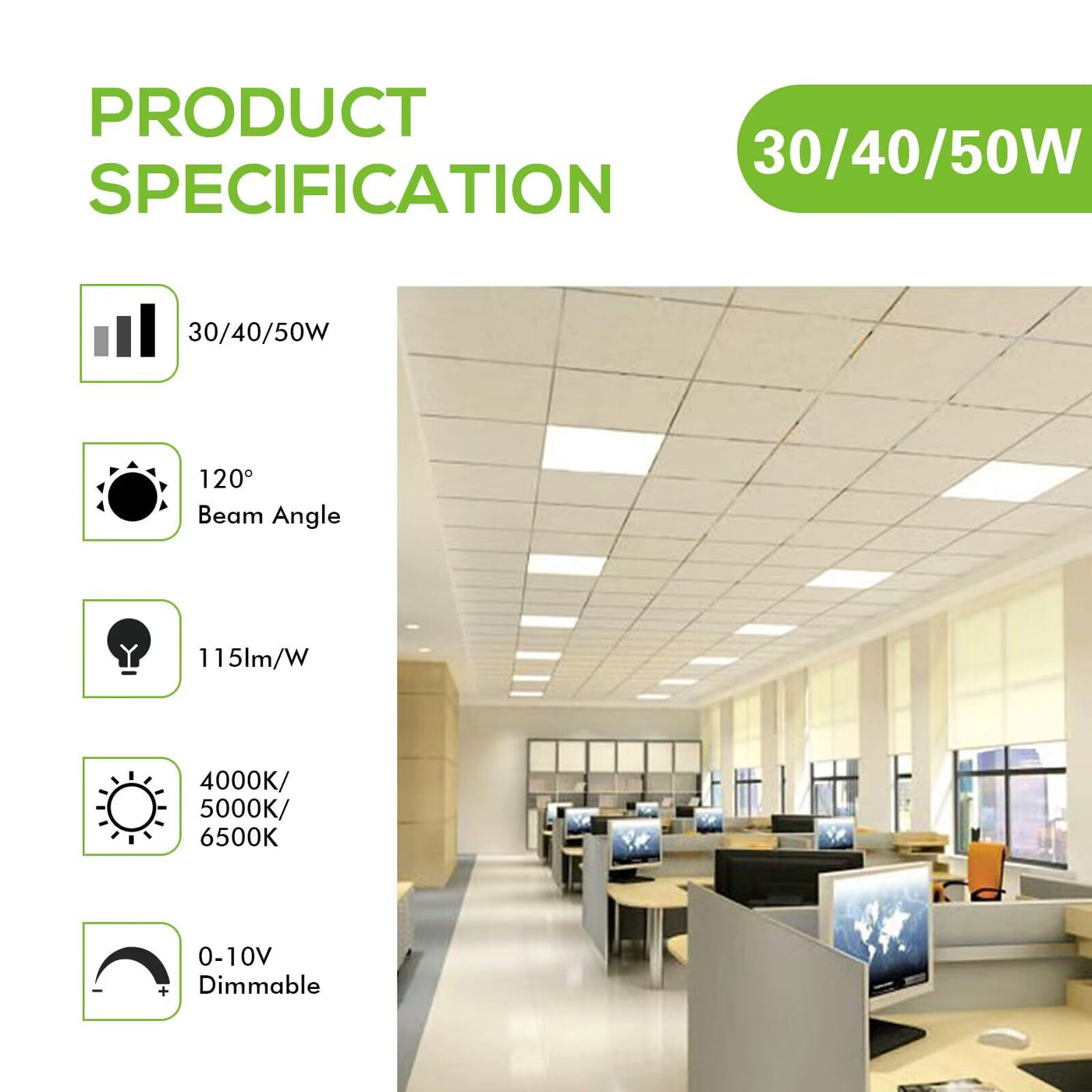 Consumes 50W to replace 128W traditional fluorescent light Durable, powder-coated white frame wWall control switchith seamless bezel Unique, Ultra-slim design 0-10V Dimmable Input Voltage: 100-277VAC 50/60Hz 5500 lumens brightness with 5000K daylight white Three alternative mounting options are available: built-in, surface and suspended. Please note: accessories for suspended and surface mounting should be bought separately