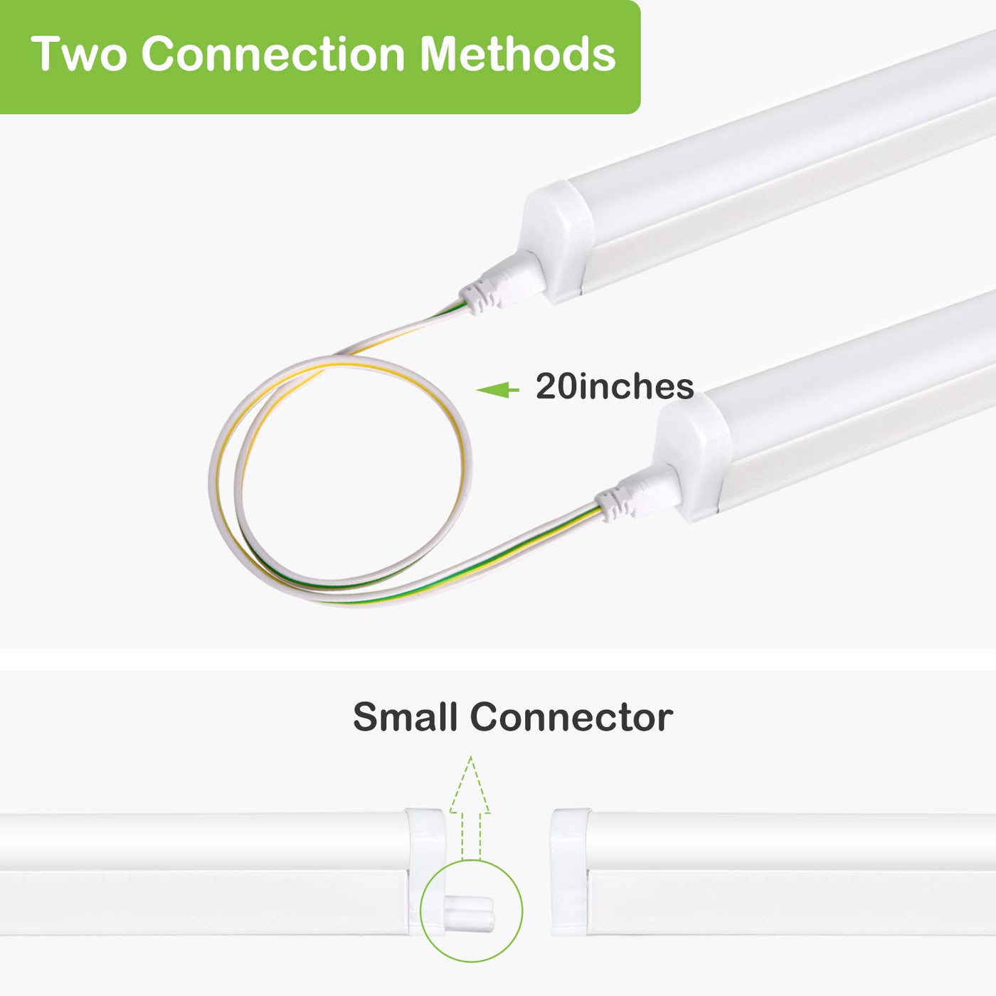 ? Up to 65% Energy Saving - T5 LED shop lights features 2200 lumens brightness by using only 22W, 40W equivalent to a fluorescent tube, provides a 65% reduction in energy usage. | ? Linkable - Using 20'' cords or seamless connectors to connect up to 7 pcs linkable shop lights together in your garage, cupboard, workshop, under cabinet and storage room. | ? Lightweight - The 4ft T5 shop light weighs only 0.8lb/pc, it can be easily fixed firmly by attached 2 screws and 2 clips. | ? Easy Installation- Plug & Play. Come with 59'' power cord with on/off switch, and other small accessories in the INNER BOX, no external or internal wiring needed.