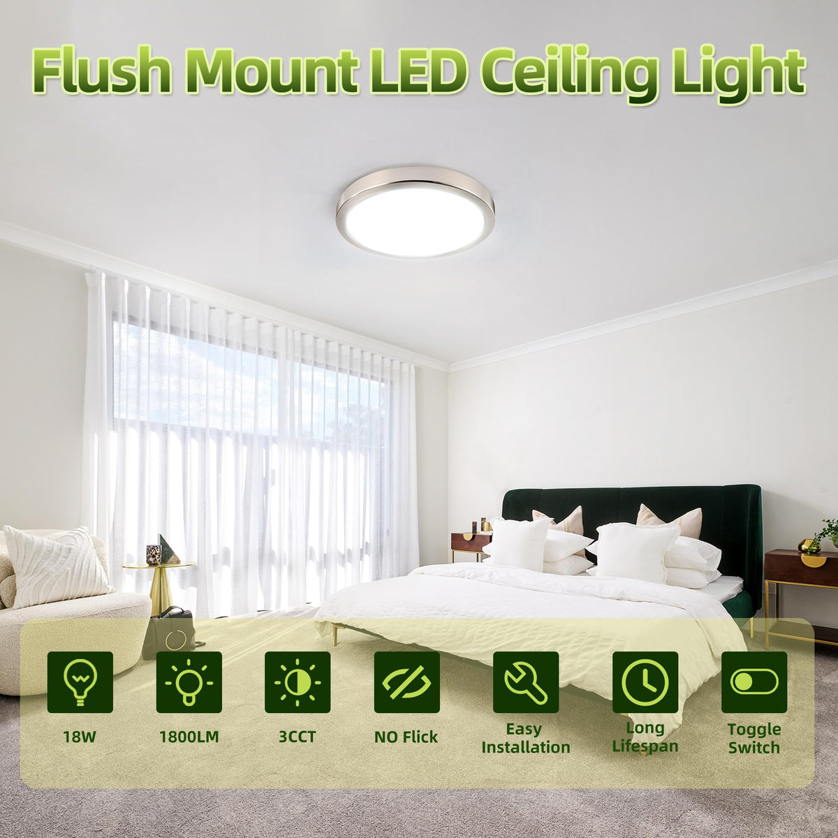 Crafted from durable metal, this 18W light fixture features a unique selectable color temperature (CCT) function, allowing users to easily switch between three different color temperatures: warm white (3000K), cool white (4000K), and daylight (5000K). This versatility makes it suitable for different moods and tasks, ensuring optimal lighting conditions for any environment. The ultra-slim design, less than one inch in thickness, makes it perfect for low ceiling areas, while the advanced built-in LEDs provide smooth, flicker-free illumination without any buzzing, contributing to a comfortable atmosphere.