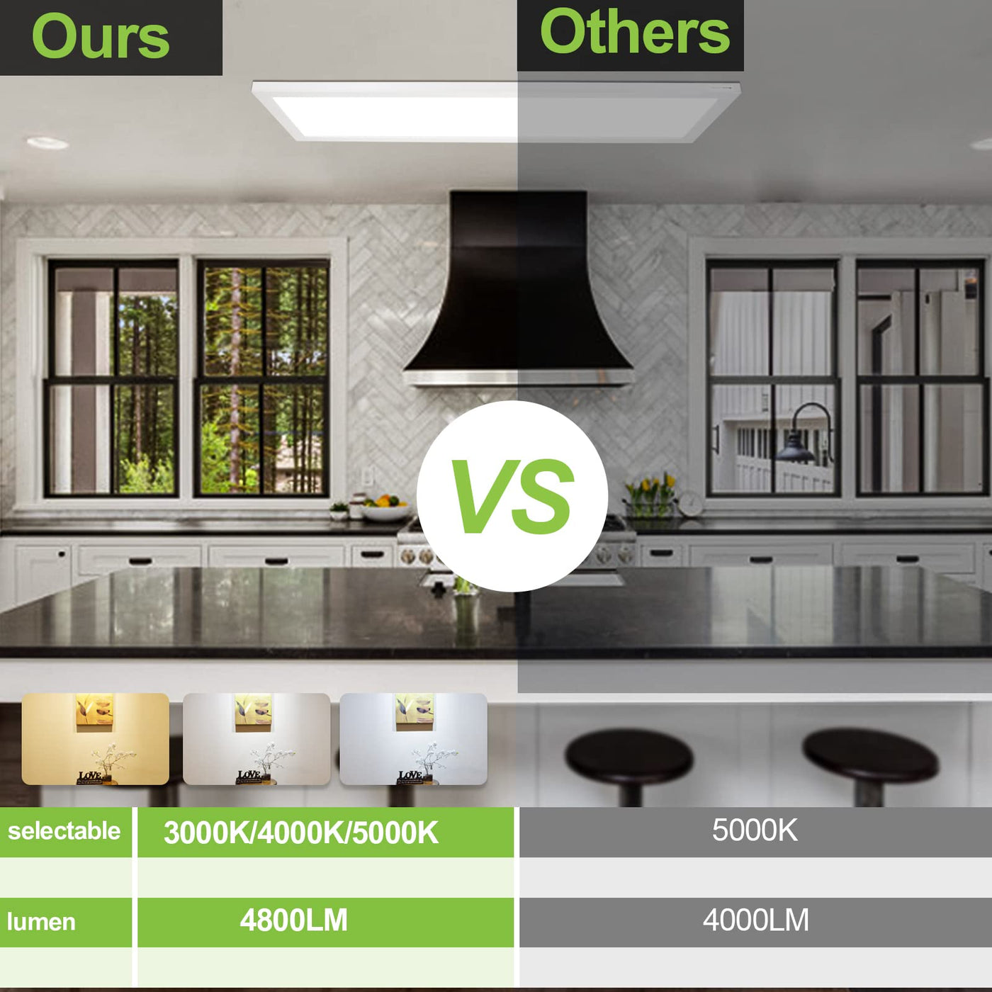 Constructed with durable plastic, this LED panel light features a low-profile design that measures less than 1 inch in thickness, making it suitable for low ceiling areas. The edge-lit technology ensures even light distribution while minimizing glare, providing a comfortable lighting experience. With a brightness output of 4800 lumens and a power consumption of just 48 watts, this panel light is an energy-efficient choice for illuminating bedrooms, kitchens, closets, bathrooms, living rooms, garages, and basements.