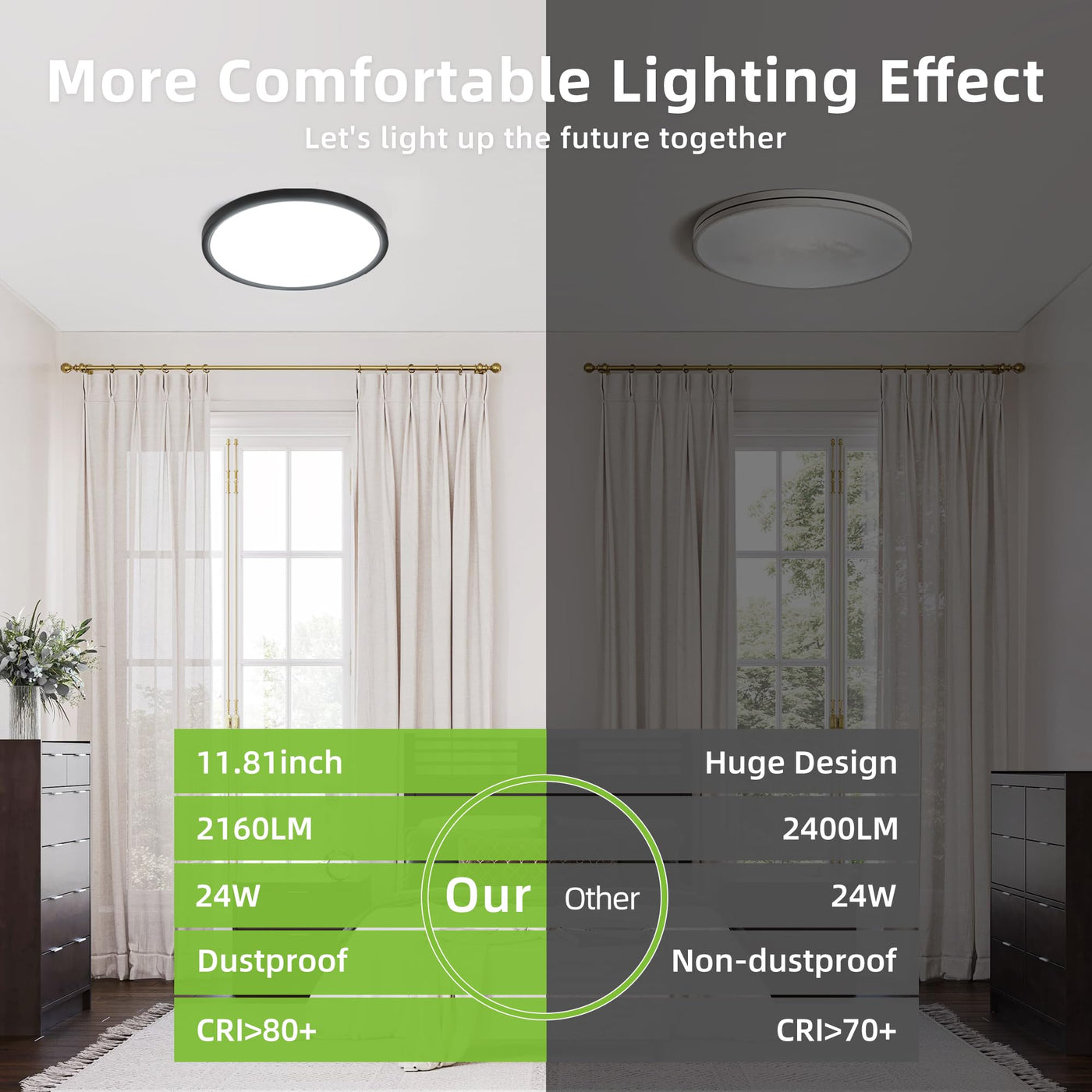 The flush mount ceiling light features a sleek, ultra-slim design that fits seamlessly into low ceiling areas. Its edge-lit technology ensures even illumination without flickering or buzzing, making it an ideal choice for those seeking both style and functionality. With a built-in 24W LED, this fixture eliminates the need for traditional bulbs, providing a long-lasting and energy-efficient lighting solution.