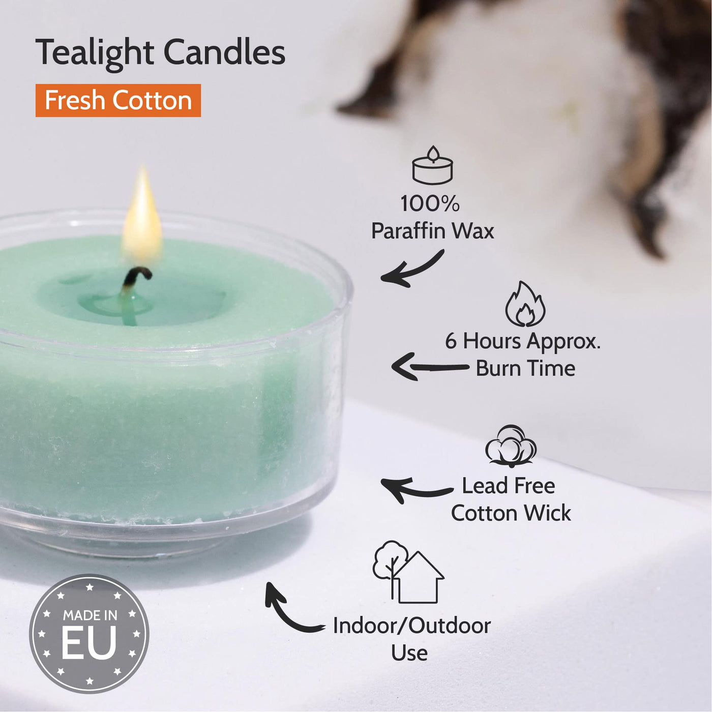 - High Grade Highly Scented Paraffin Wax - Lead-free 100% Cotton Wick, non-toxic - Made In Europe by A Brand You Can Trust - Fresh Cotton Scented Candles - Light Green Tea Light Candles Scented - Elegant Looking - Indoor / Outdoor Use - 6 Hour Burn Time - 15-Pack - 0.9" Height x 1.5" Diameter (23mm x 40mm)