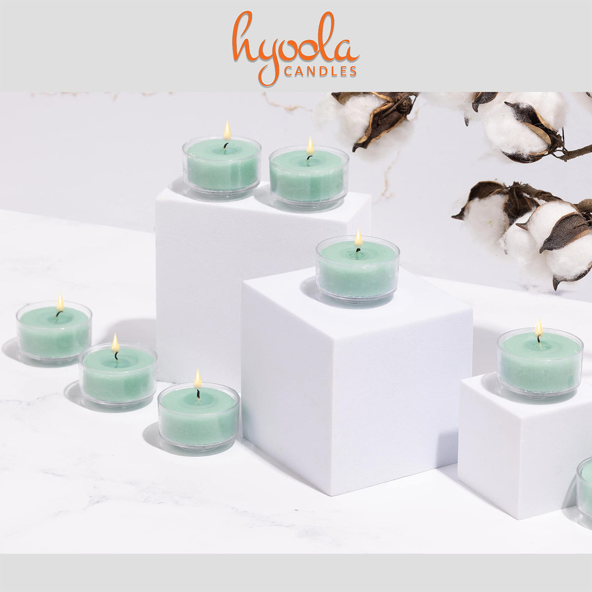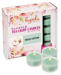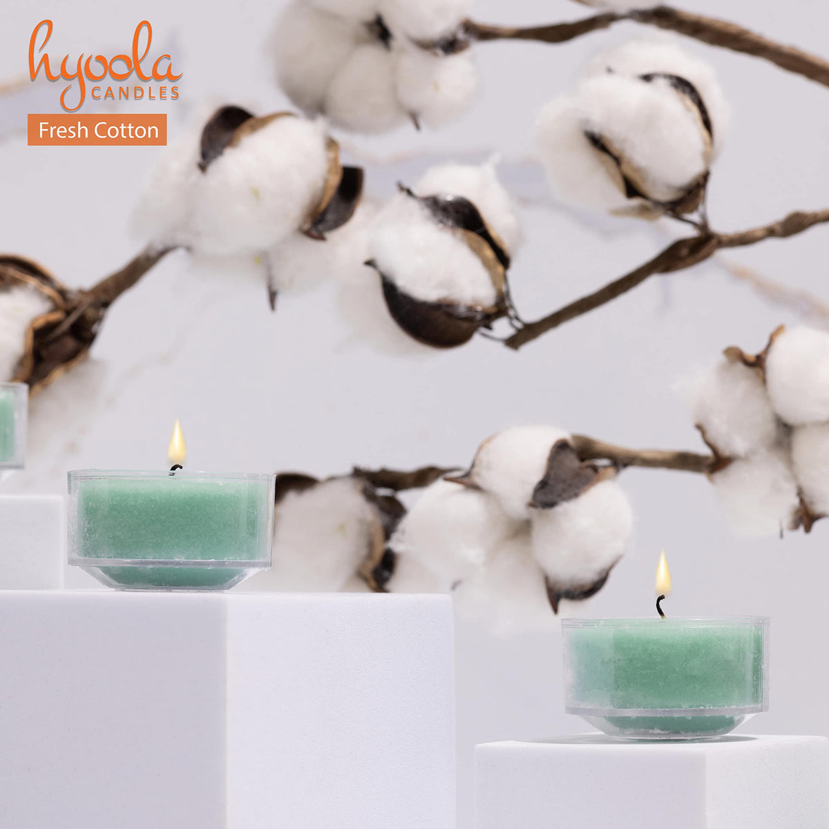 Q: What scents are available in the Hyoola Scented Tealight Candles?A: The Hyoola Scented Tealight Candles are available in a Fresh Cotton scent, which provides a clean and inviting aroma suitable for various settings.