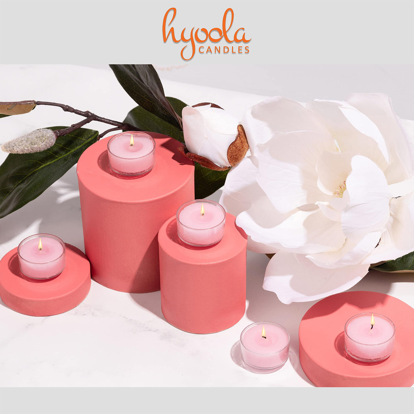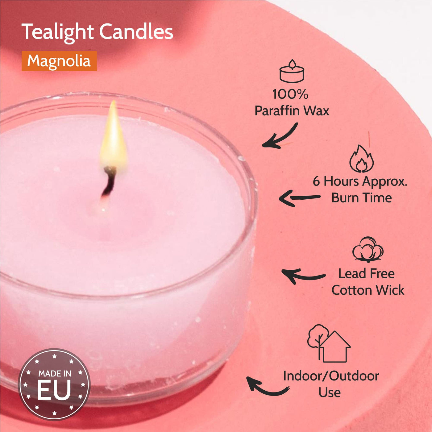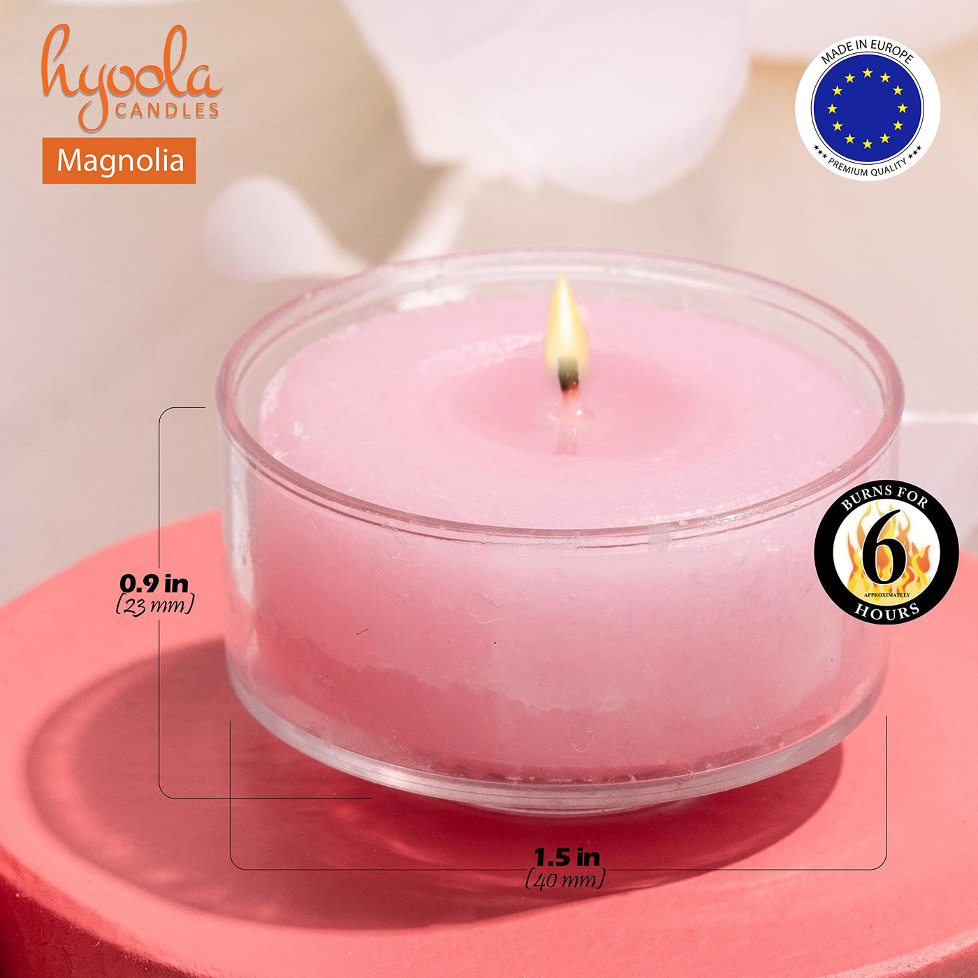 - High Grade Highly Scented Paraffin Wax - Lead-free 100% Cotton Wick, non-toxic - Made In Europe by A Brand You Can Trust - Magnolia Scented Candles - Light Pink Tea Light Candles Scented - Elegant Looking - Indoor / Outdoor Use - 6 Hour Burn Time - 15-Pack - 0.9" Height x 1.5" Diameter (23mm x 40mm)