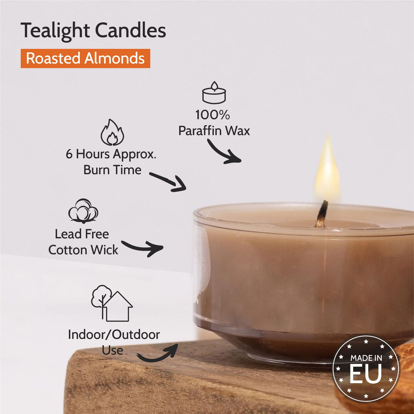 - High Grade Highly Scented Paraffin Wax - Lead-free 100% Cotton Wick, non-toxic - Made In Europe by A Brand You Can Trust - Roaste ALmonds Scented Candles - Light Brown Tea Light Candles Scented - Elegant Looking - Indoor / Outdoor Use - 6 Hour Burn Time - 15-Pack - 0.9" Height x 1.5" Diameter (23mm x 40mm)