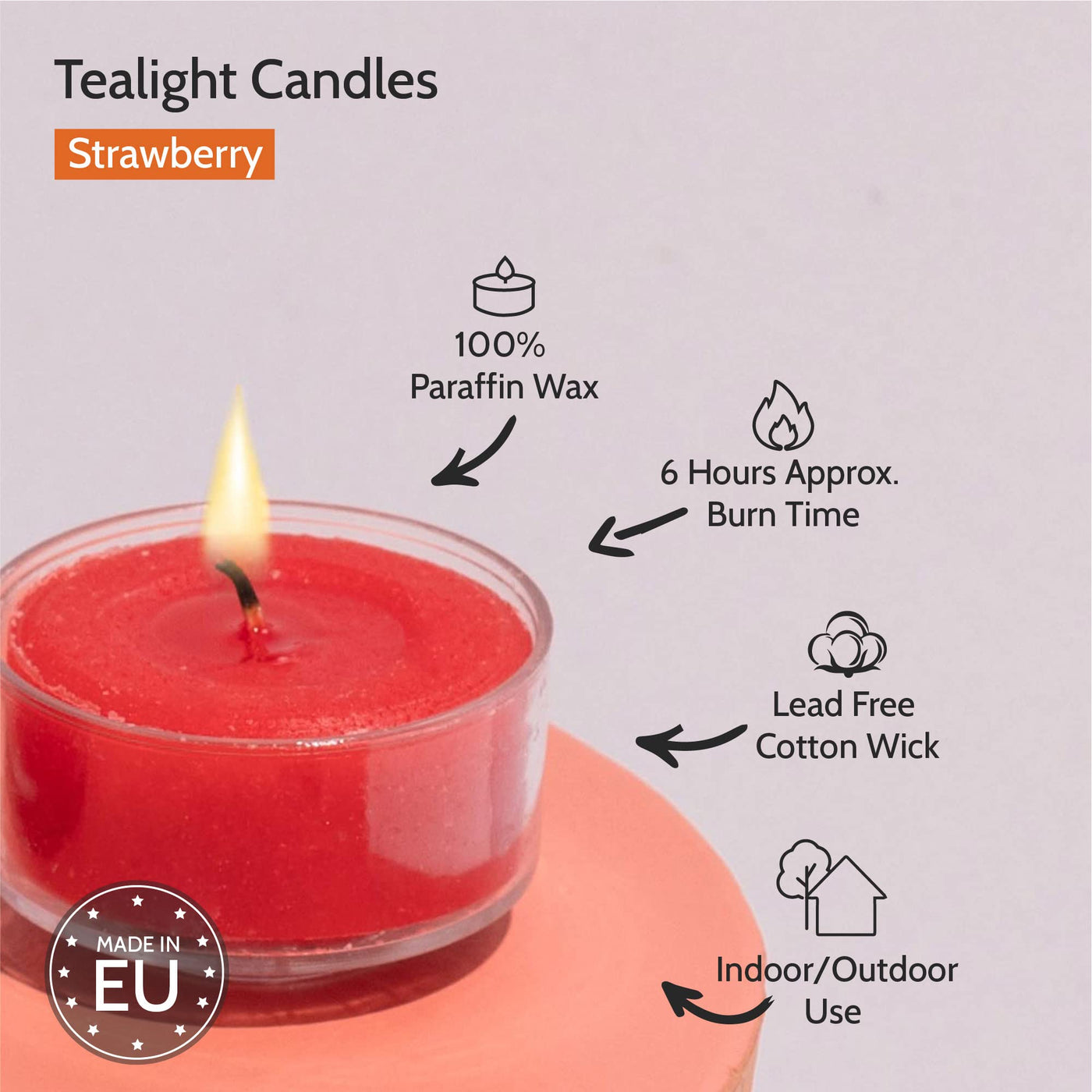 - High Grade Highly Scented Paraffin Wax - Lead-free 100% Cotton Wick, non-toxic - Made In Europe by A Brand You Can Trust - Strawberry Scented Candles - Red Tea Light Candles Scented - Elegant Looking - Indoor / Outdoor Use - 6 Hour Burn Time - 15-Pack - 0.9" Height x 1.5" Diameter (23mm x 40mm)