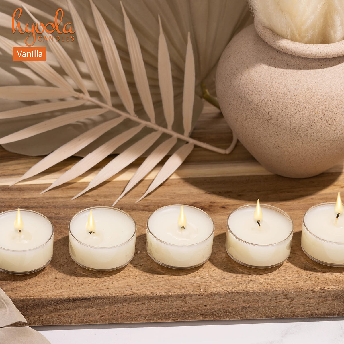 Q: What scents are available in Hyoola tealight candles?A: These tealight candles are available in a delightful vanilla scent, perfect for creating a warm and inviting atmosphere in any setting.