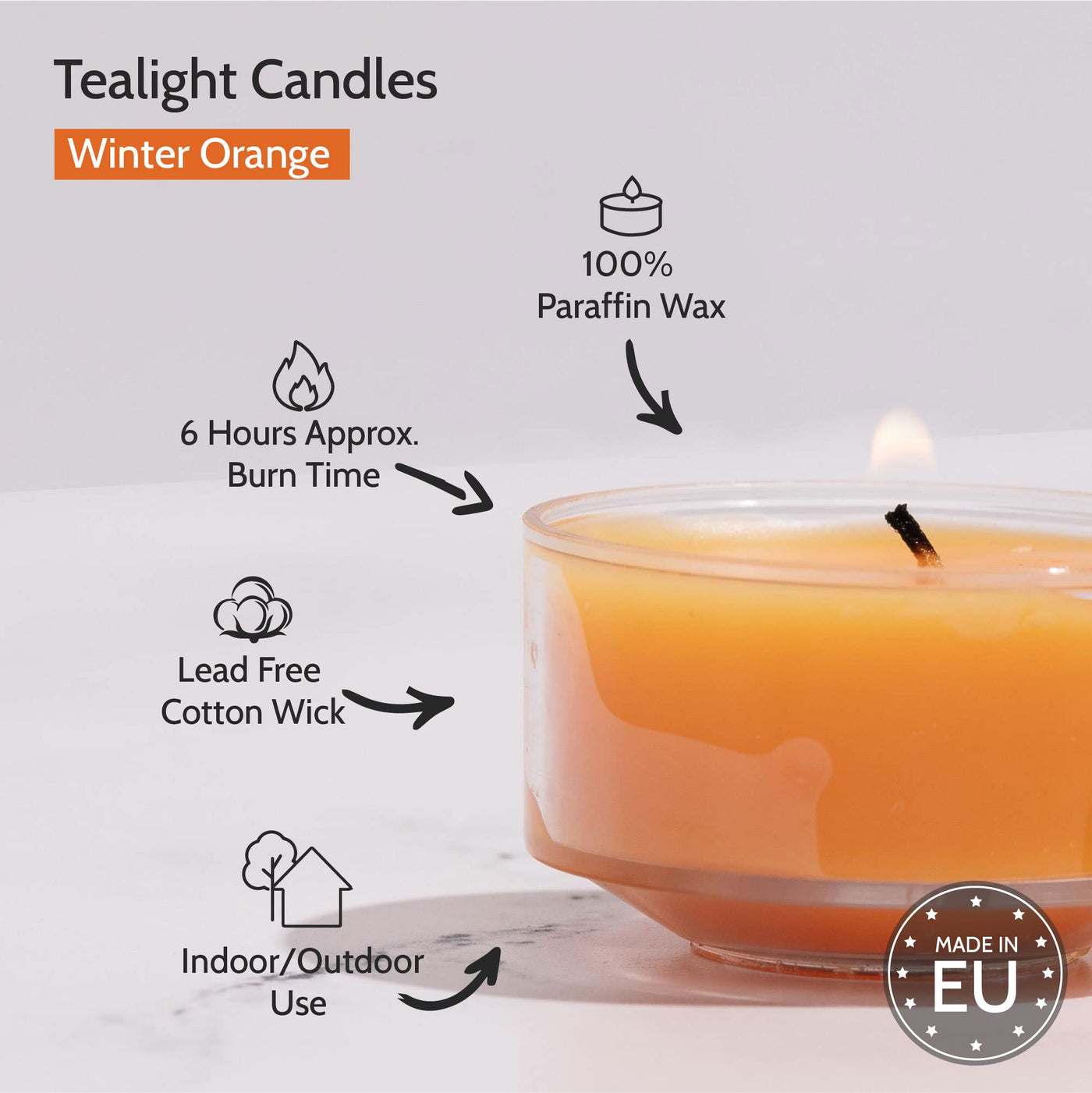- High Grade Highly Scented Paraffin Wax - Lead-free 100% Cotton Wick, non-toxic - Made In Europe by A Brand You Can Trust - WInter Orange Scented Candles - Orange Tea Light Candles Scented - Elegant Looking - Indoor / Outdoor Use - 6 Hour Burn Time - 15-Pack - 0.9" Height x 1.5" Diameter (23mm x 40mm)
