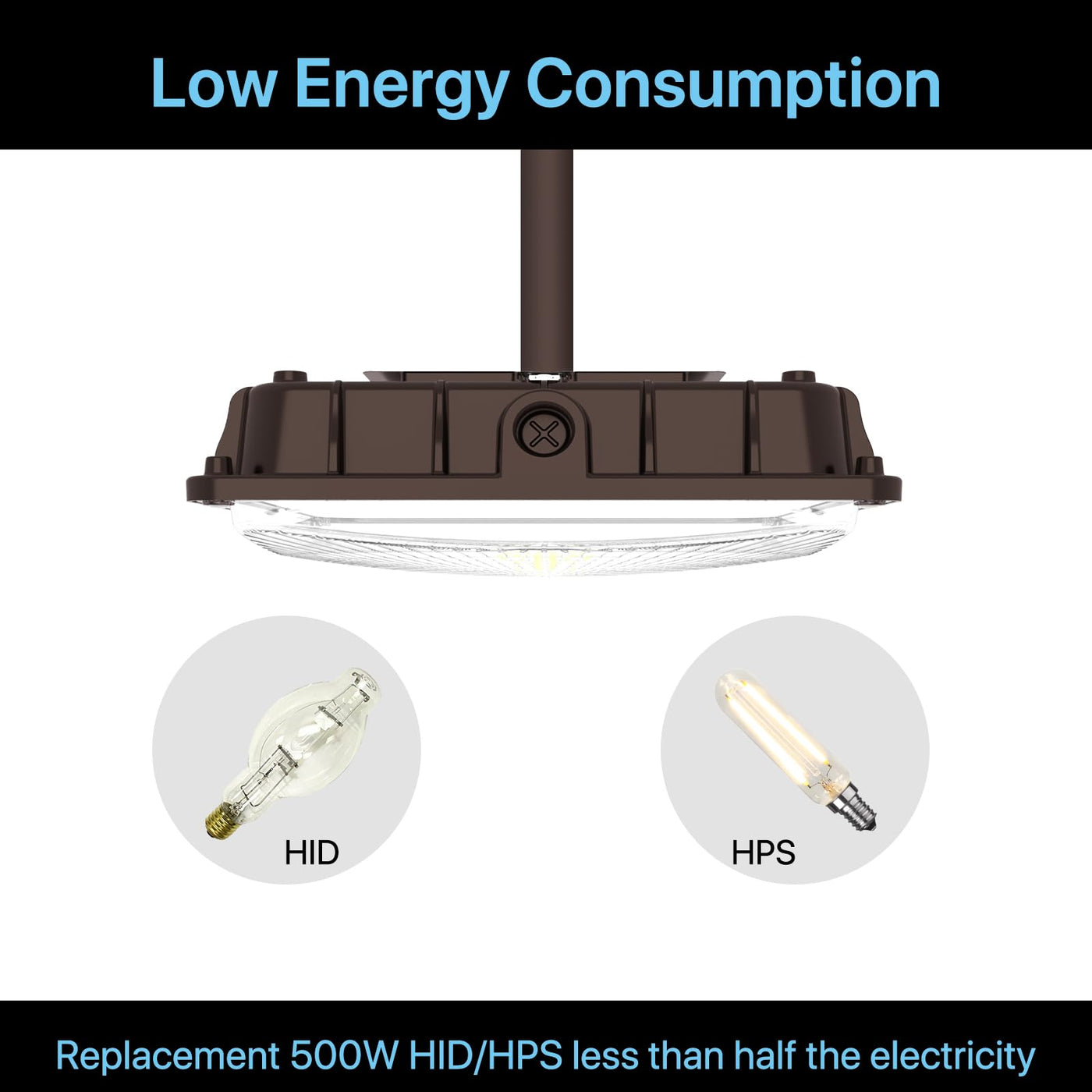 80% Energy Savings: Equivalent to a 500W metal halide or HID light, this LED Canopy Light Fixture ensures substantial energy savings while providing a quieter and cooler lighting environment.