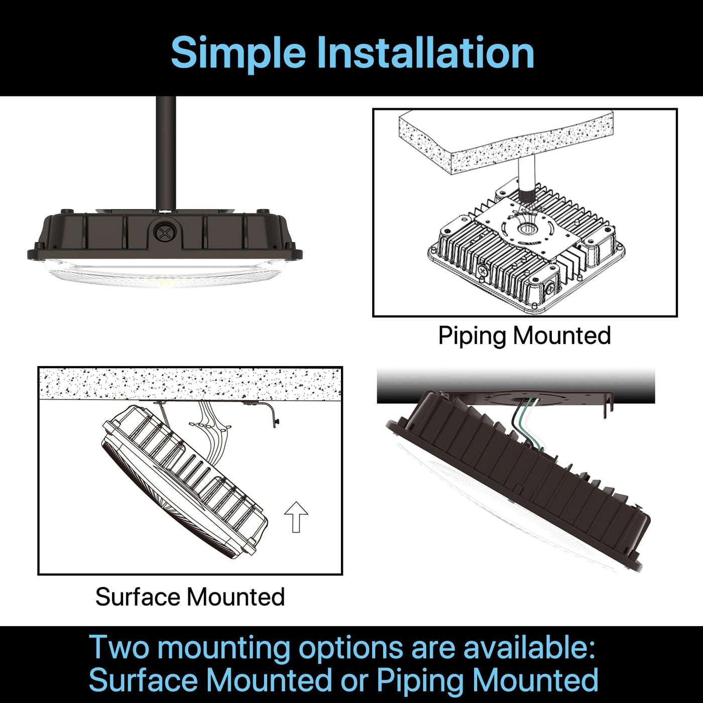 Simple Installation: Designed for convenience, the HYPERLITE gas station carport ceiling light offers two straightforward installation methods: surface mounting with J-box or pendant mounting with 3/4 inch conduit.