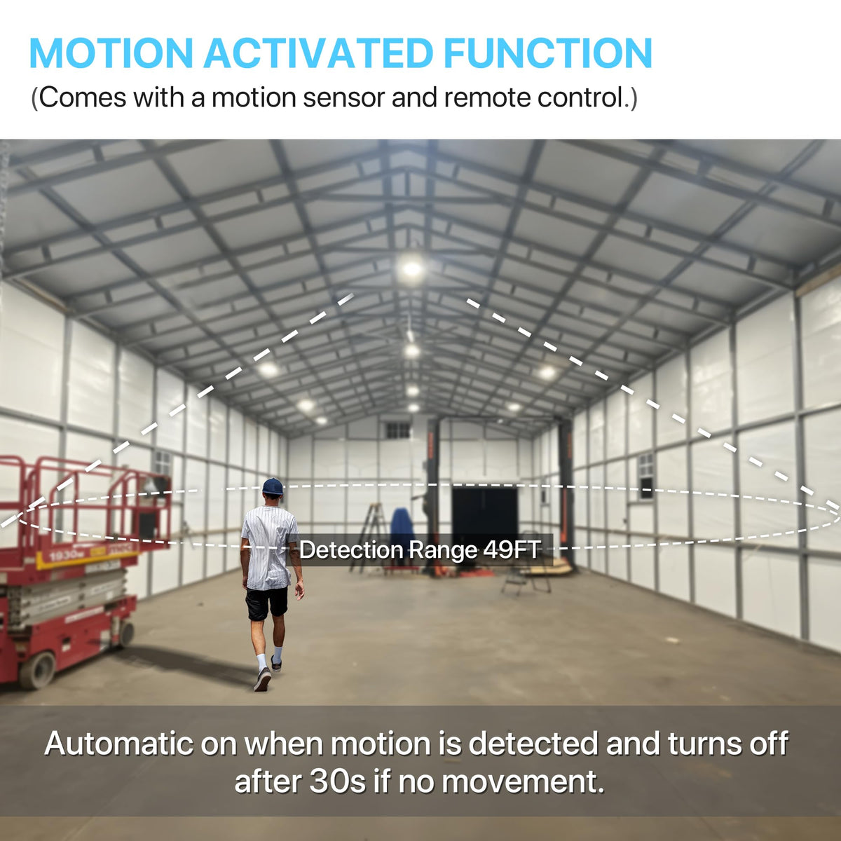 Q: How does the motion sensor feature work in these high bay lights?A: The motion sensor in the HYPERLITE high bay lights is designed to activate the lighting for 30 seconds upon detecting movement, such as people or vehicles. If no movement is detected within that time, the lights will automatically turn off, providing energy savings and convenience.
