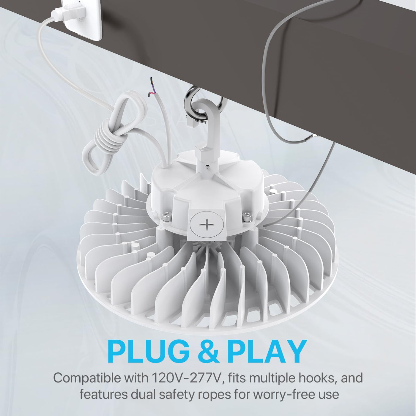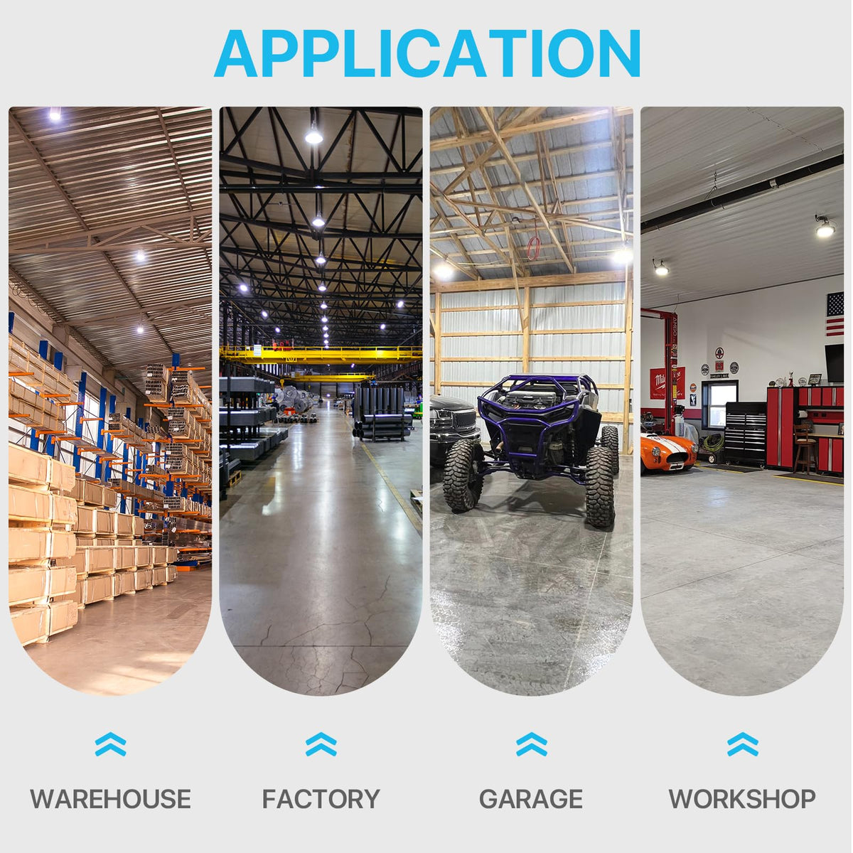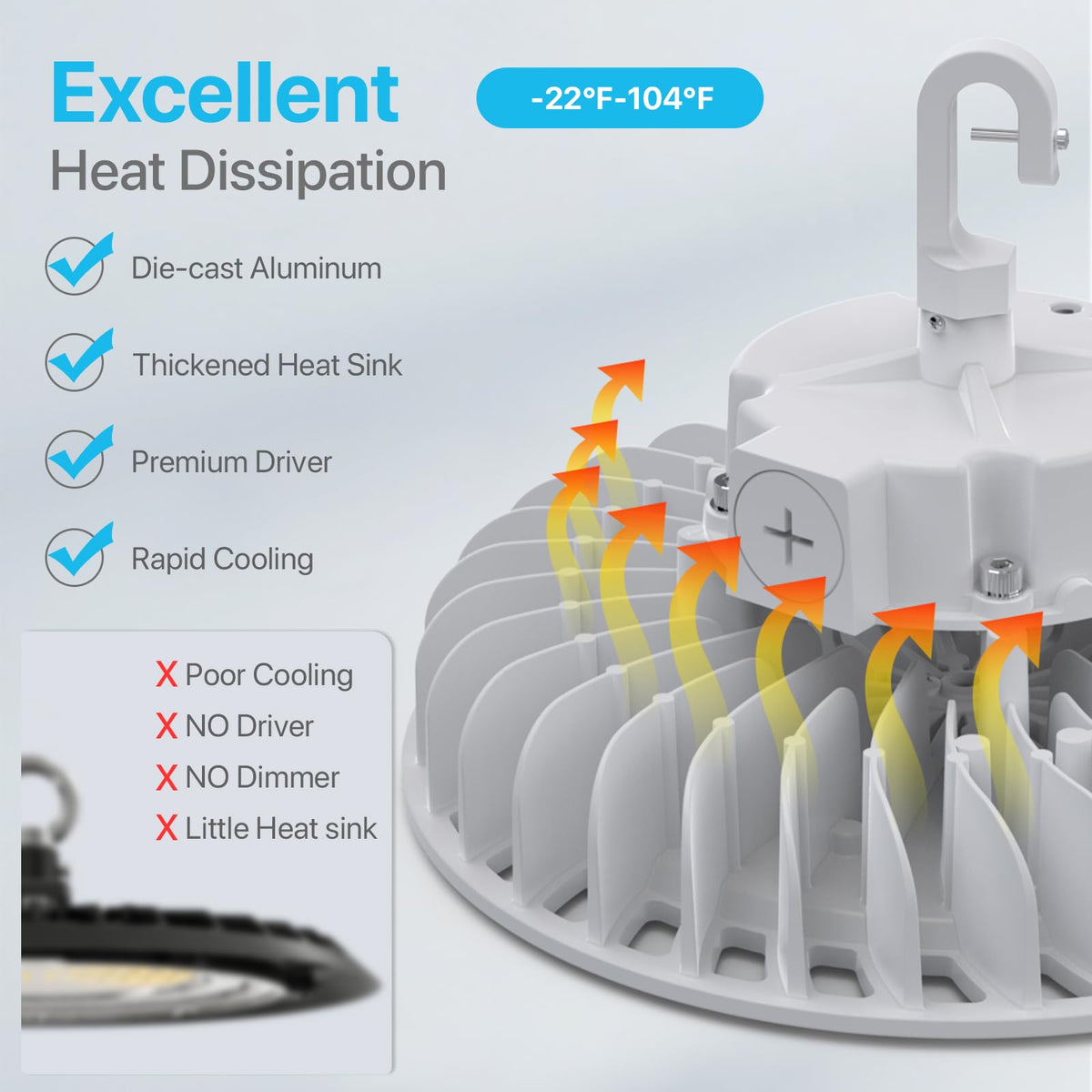 This High Bay Light Is Built With enhanced Materials, Featuring A Durable Aluminum Construction That Ensures Longevity And Optimal Performance. Its Innovative Cold-Forged Aluminum Design Enhances Thermal Transfer, Which Not Only Extends The Lifespan Of The Light But Also Prevents Overheating And Damage. The Cool White 4000K Light Provides A Color-Comfortable Experience, Reducing Eye Fatigue And Enhancing Visibility In Work Environments.