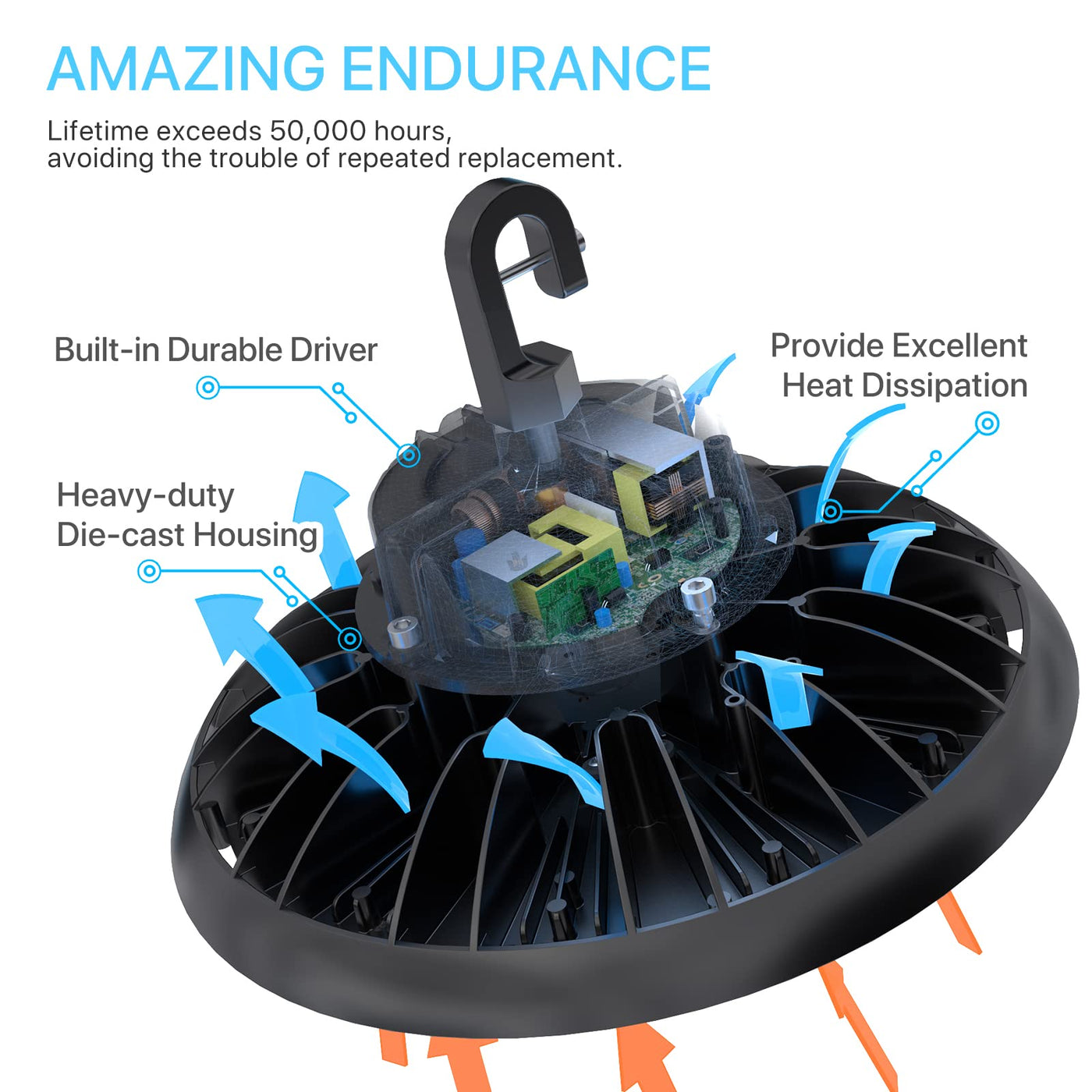 Q: Is this LED high bay light easy to install?A: Yes, the HYPERLITE high bay LED light comes with a 5-foot power cord with a standard 110V US plug and includes a G-shaped hanging hook and safety cable for quick installation. It can be set up in about 3 minutes without the need for complex wiring.