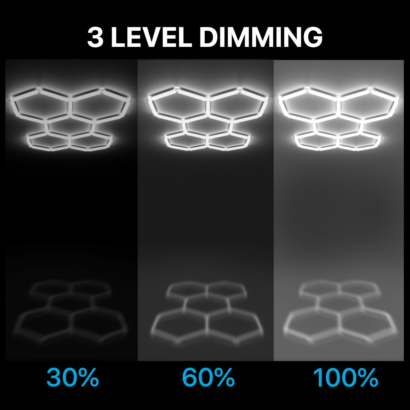 Q: Can I adjust the brightness of the hexagon garage lights?A: Yes, this LED light features a 3-level dimming function, allowing you to customize the brightness according to your needs, whether for detailed work or general illumination.
