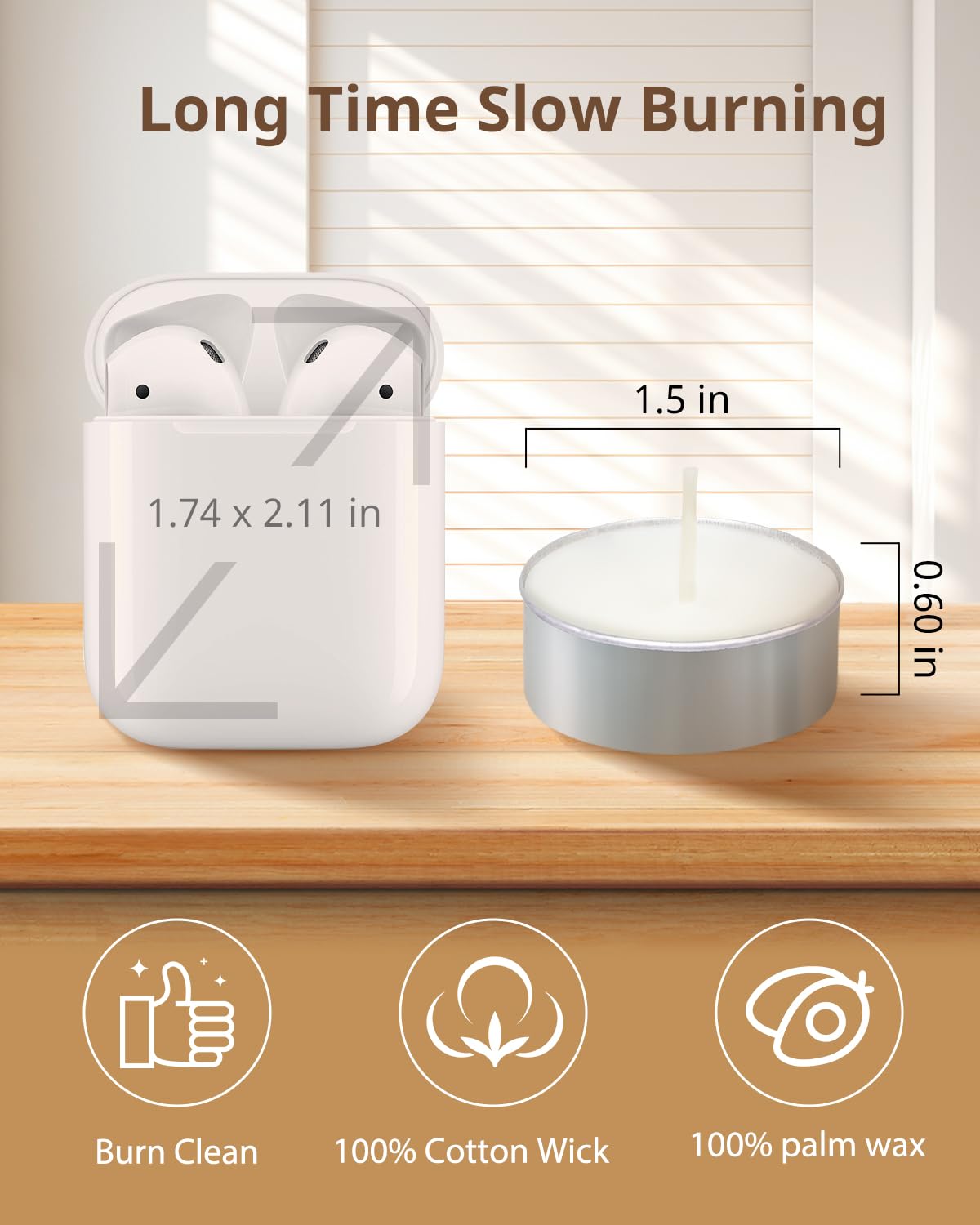 Q: What materials are used in these tealight candles?A: These tealight candles are made from 100% natural palm wax and feature pure cotton wicks, offering a clean and sustainable burning experience compared to traditional paraffin candles.