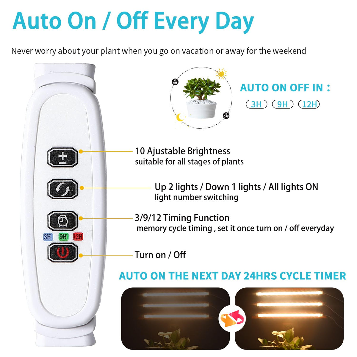 Q: How do the auto on/off and timing functions work?A: The grow light strips come equipped with a cycle memory timer that allows you to set the lights to automatically turn on and off at the same time each day. You can choose from 3, 9, or 12-hour settings, which is perfect for maintaining a consistent light schedule for your plants, even when you're away.