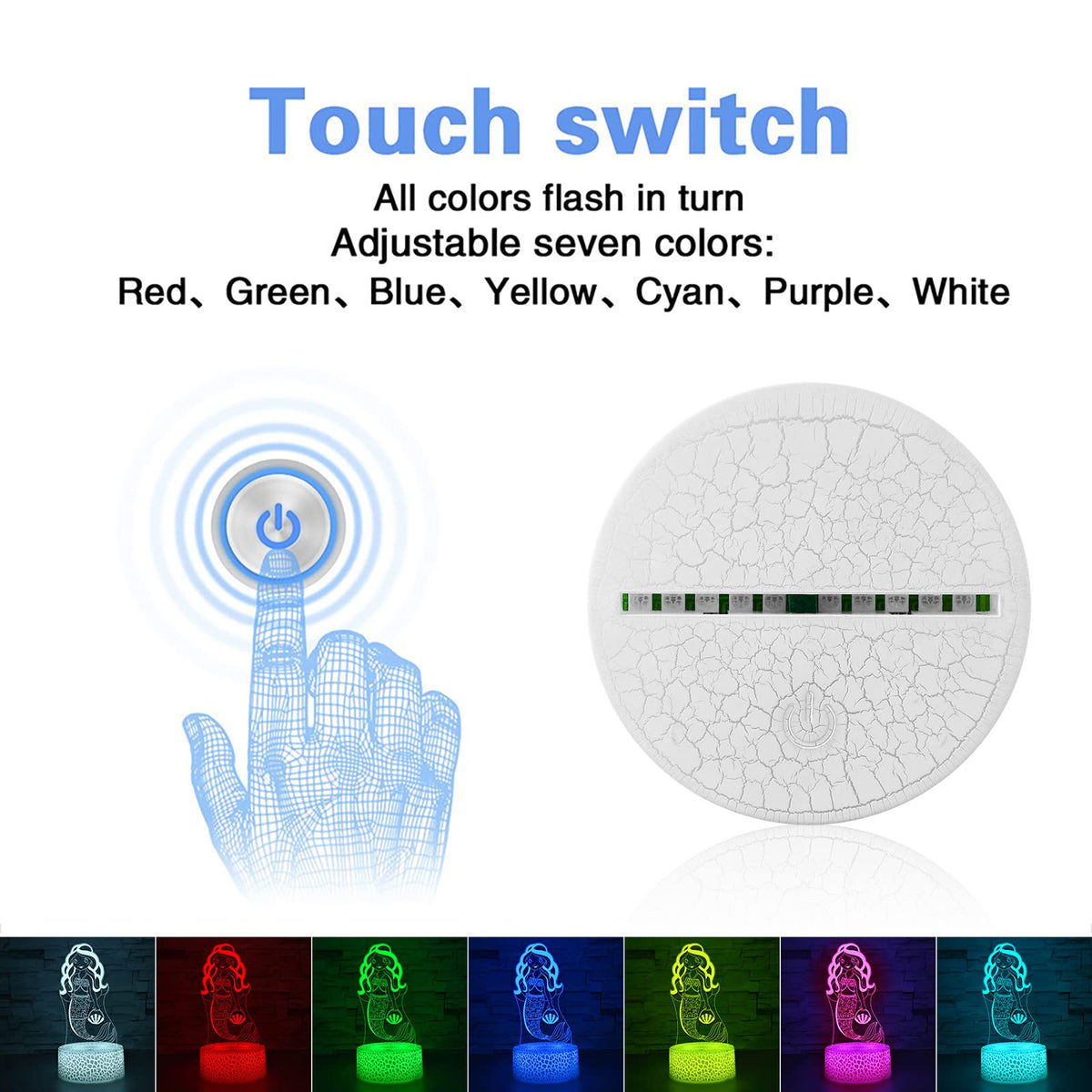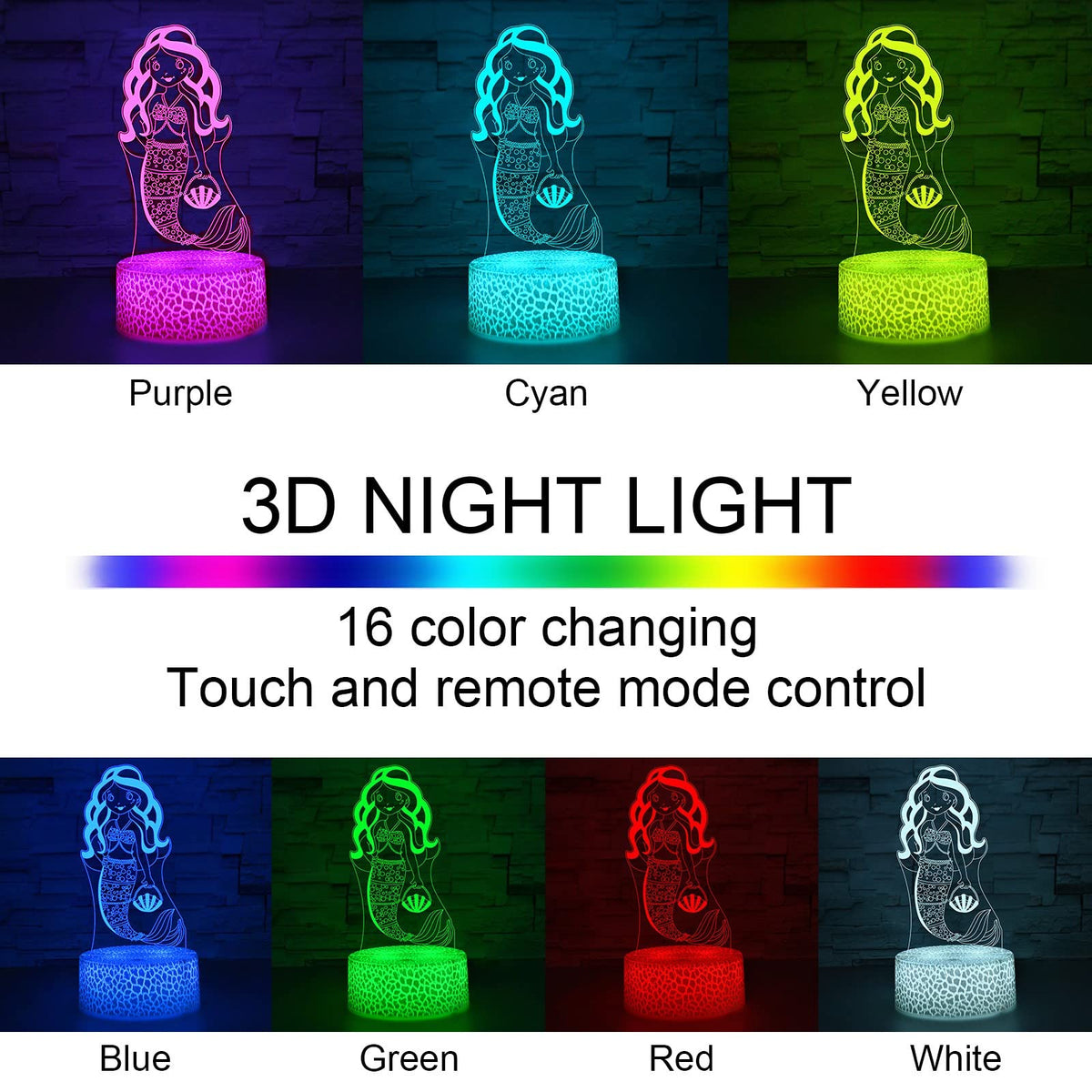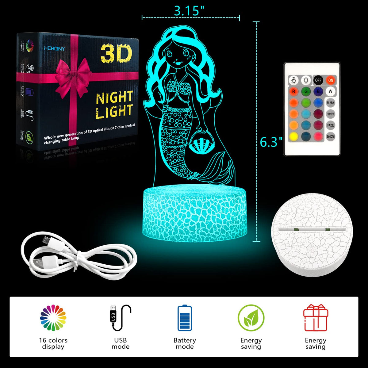 I-Chony - Mermaid Toys Night Light Made For Kids And Family! Made With 3D Laser Engraving Technology Can Fixed One Color Or 7 Colors Auto Gradual Changing Night Lights -- Red, Green, Blue, Yellow, Purple,Cyan, White. Mermaid 3D Light With Touch & Remote Control 16 Color Changing. It Is A Great Creative Decoration Lights For Kids Bedroom, Living Room, Dinning Room. Perfect Gifts - Mermaid Themed Toys - Birthday Gifts - Mermaid Gifts - Christmas Gifts - New Year'S Gifts For Teens Boys Girls Kids. Parameter: Light Bulb Material: Acrylic Number Of Led: 10 Pcs Led Life Span: 10000 H + Power: 0.4W Voltage: 5V Power Spend: 0.012Kw.H/24 Hours Power Supply: 3* Aa Batteries ( Not Included)Or Usb Connection(Mobile Power, Computer, Suitable For Most Usb Ports) 3 *Aa Battery Life Time: More Than 60 Hours (Low Power Consumption) Package Includes: 1* Remote Control 1* Acrylic Panel 1* Color-Changing Abs Base 1* Usb Cable, Length: 31 Inches 1* User Manual Note: 1. Usb And 3Aa Batteries Cannot Be Powered Together At The Same Time. 2. Please Remove The Surface Protective Film Before Use. 3. Do Not Touch The Acrylic Plate Surface With Your Fingers To Avoid Finger Print Marks On The Plate Which May Affect The 3D Illusion.