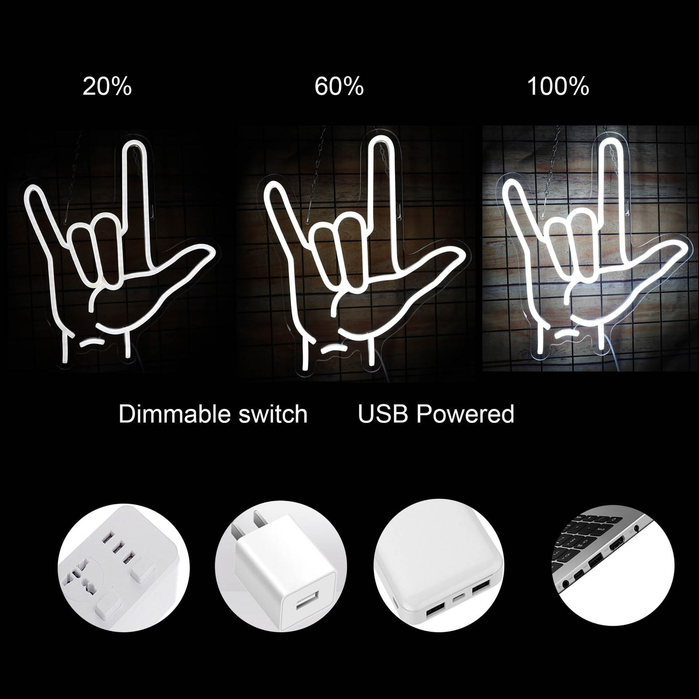 Q: How is the I Love You Neon Sign powered?A: This neon sign is USB powered, allowing it to be connected to power banks, laptops, or USB wall adapters for versatile use in different settings.
