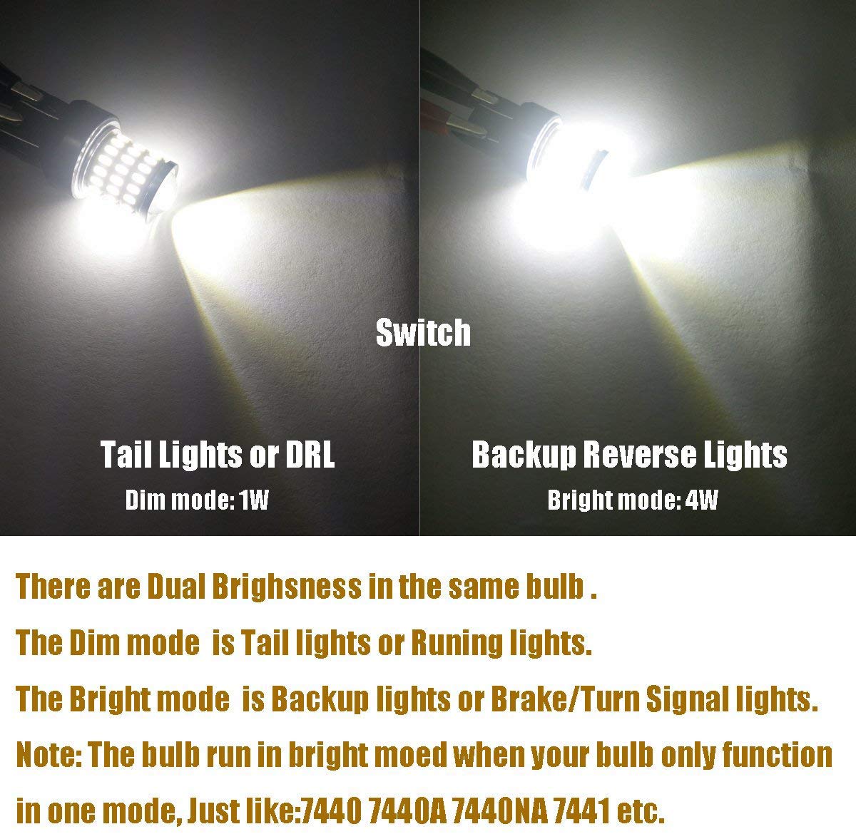 This bulb is compatible for both CK/SRCK and standard socket, Non-polarity design. Best value in the market! Features Dual Brightness: The Dim mode is Tail lights or DRL, while the Bright mode is Brake/Turn Signal lights or Back Up Reverse lights. The bulb run in Bright mode when your bulb only function in one mode. High Brightness LED: 54SMD 3014 chipset & 3SMD 3030 chipset. Working Voltage: 9-30V (fit 12V, 24V vehicles). Output Wattage: 3.8W/bulb (Low Power Consumption). Color: Xenon White 6500K. Waterproof: IP65. Service Life: Up to 30,000 Hours. Note: You will need load resistor or flash relay to prevent the hyper flash when replacement for Turn Signal Lights. IMPORTANT NOTICE! Please confirm the bulb base before placing an order. iBrightstar is a registered brand with Amazon. Please contact us if there is any questions or other requests!