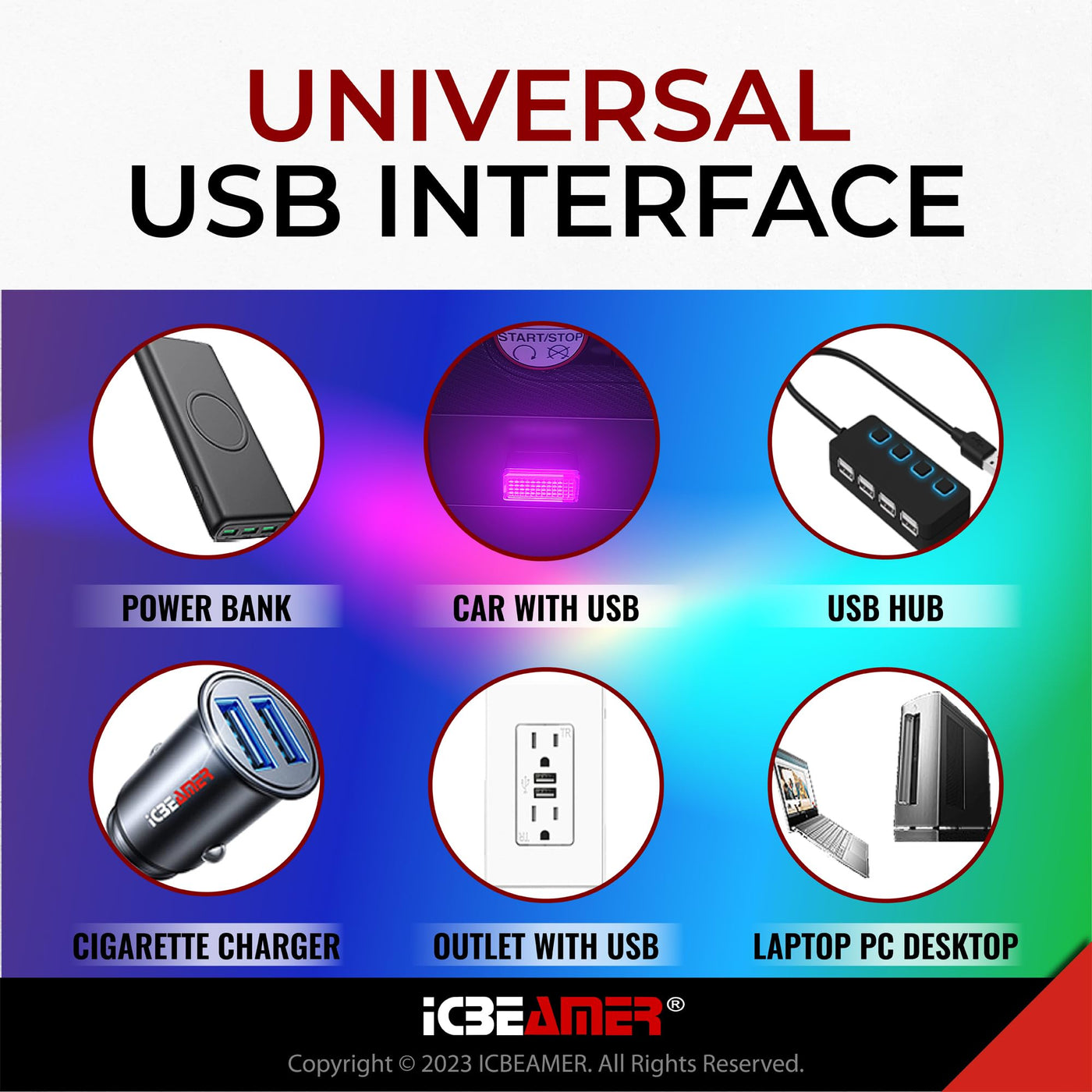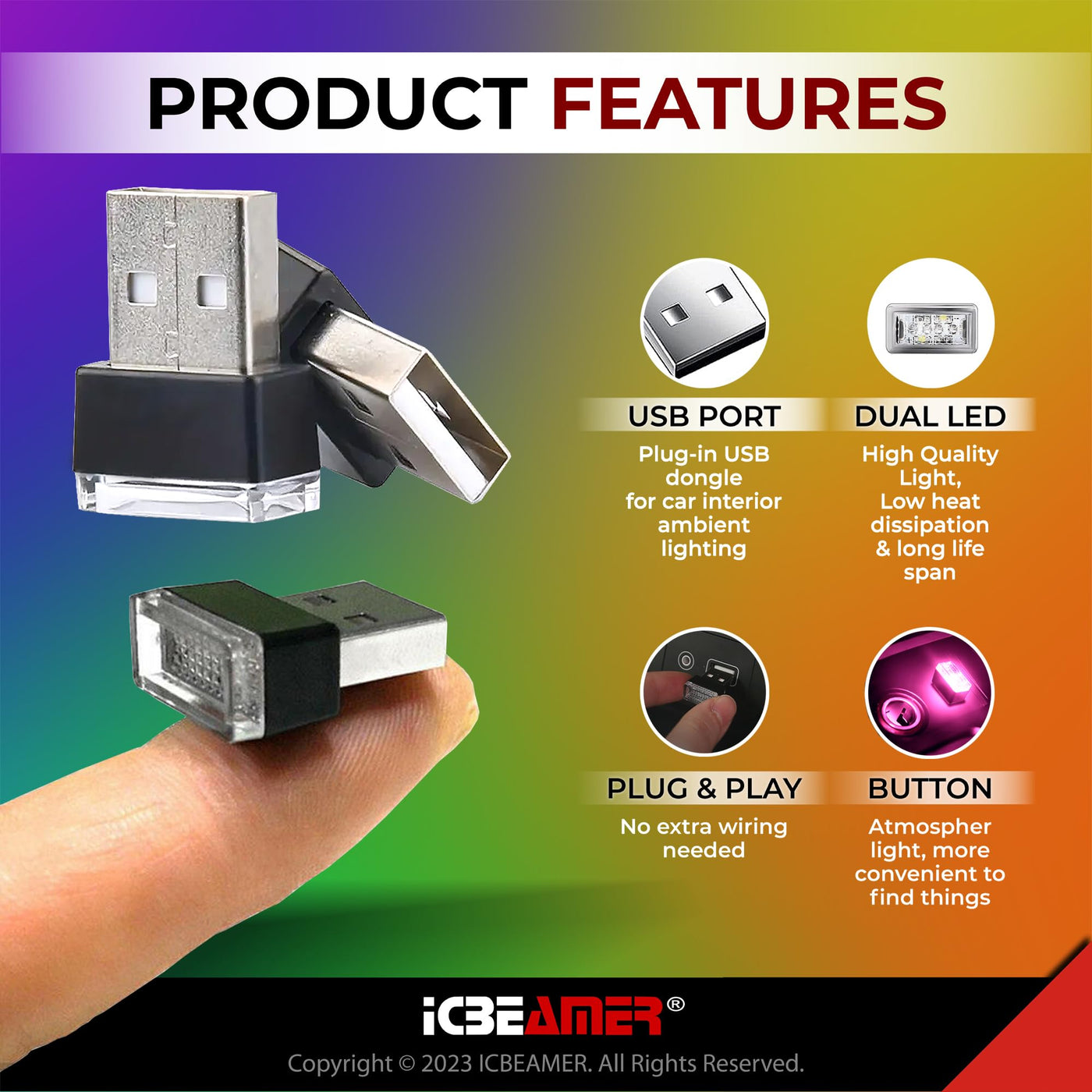Q: Is the ICBEAMER night light compatible with all USB ports?A: Yes, the ICBEAMER night light features a USB-A plug, which is compatible with any standard USB port, allowing for easy installation in your car's interior or trunk.