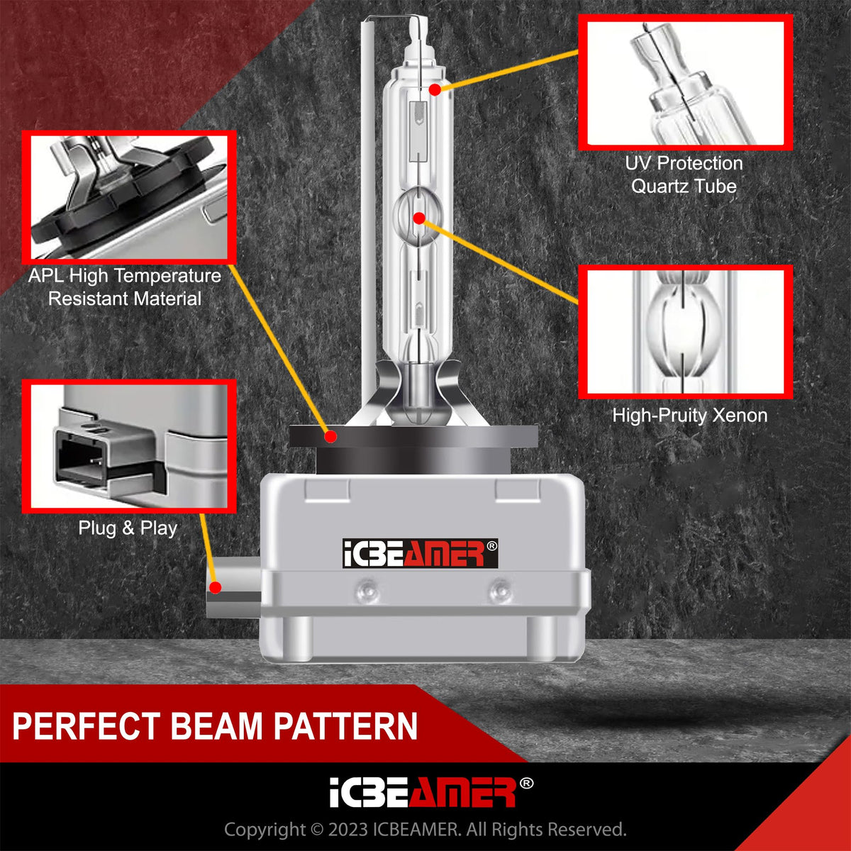 Q: How do ICBEAMER headlight bulbs compare to traditional halogen bulbs?A: ICBEAMER Xenon HID headlight bulbs are significantly brighter, providing 300% more brightness than traditional 55W halogen bulbs. They also consume 40% less power and have a much longer lifespan, making them a more efficient choice for drivers seeking improved visibility and safety.