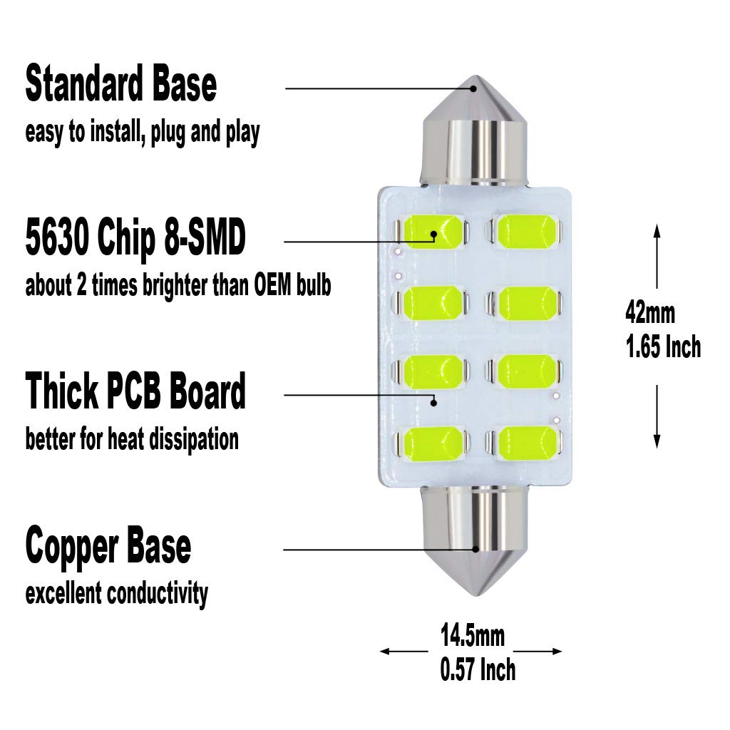 Package included: 12x bright ice blue LED lights Main Including: Map?Dome?License?Spare light Spare Light also Fit Part of Cars: 3RD Brake Light Ashtray Light Courtesy Light Engine Cover Light Glove Box Light Side Marker Light Trunk Light Feature: Easy to install, Plug and play Faster response time,No incandescent delay Low Power Consumption and Low Temperature About 2 times brightness than OEM bulbs Lasting life 50000 working hours Important Notice: LED have Polarity, please flip it 180if did not light up while installed(reverse the polarity) Flicker: Try slightly raise the led bulbs metal pin and reinsert (improve connectivity) Compatibility Table of Vehicle: