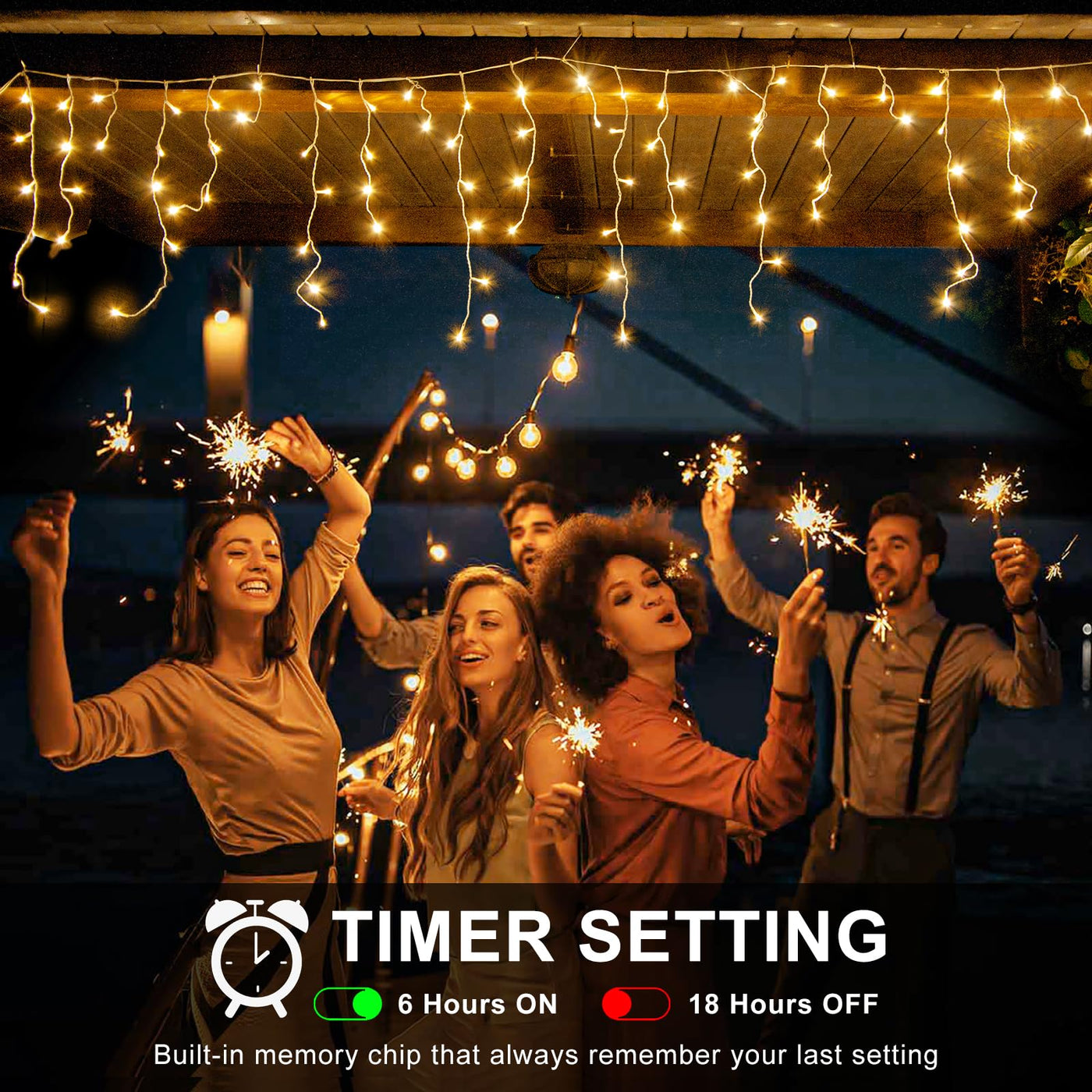 Q: How does the timer and memory function work for the icicle lights?A: The timer function allows the lights to turn on for 6 hours and off for 18 hours. To activate it, press and hold the button on the plug for 3 seconds until the green light turns on. The built-in memory chip remembers the last lighting mode used when the power is restored.