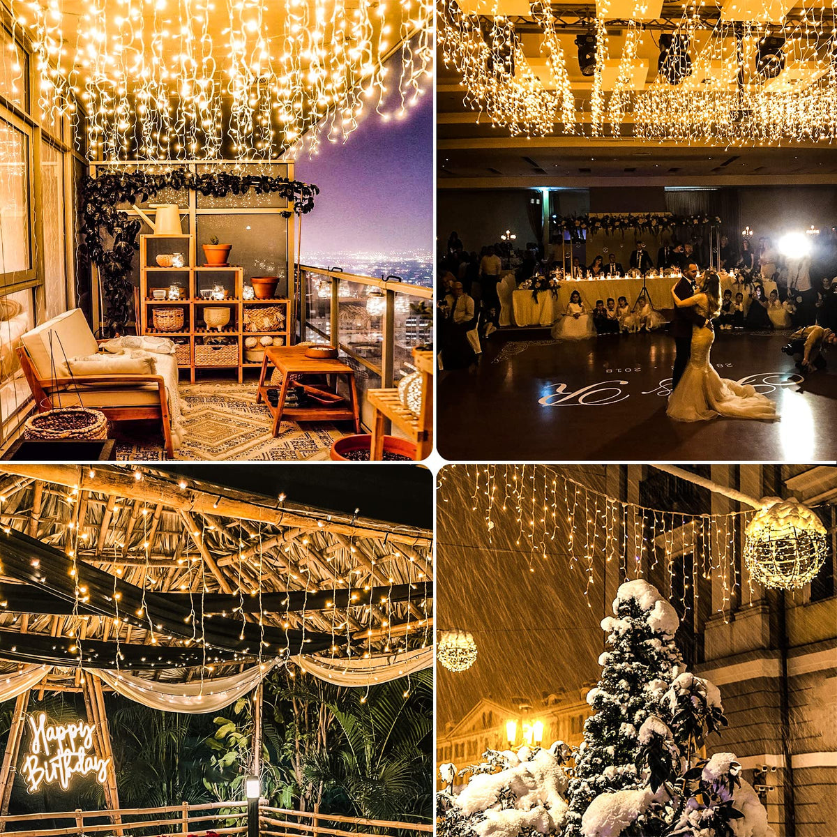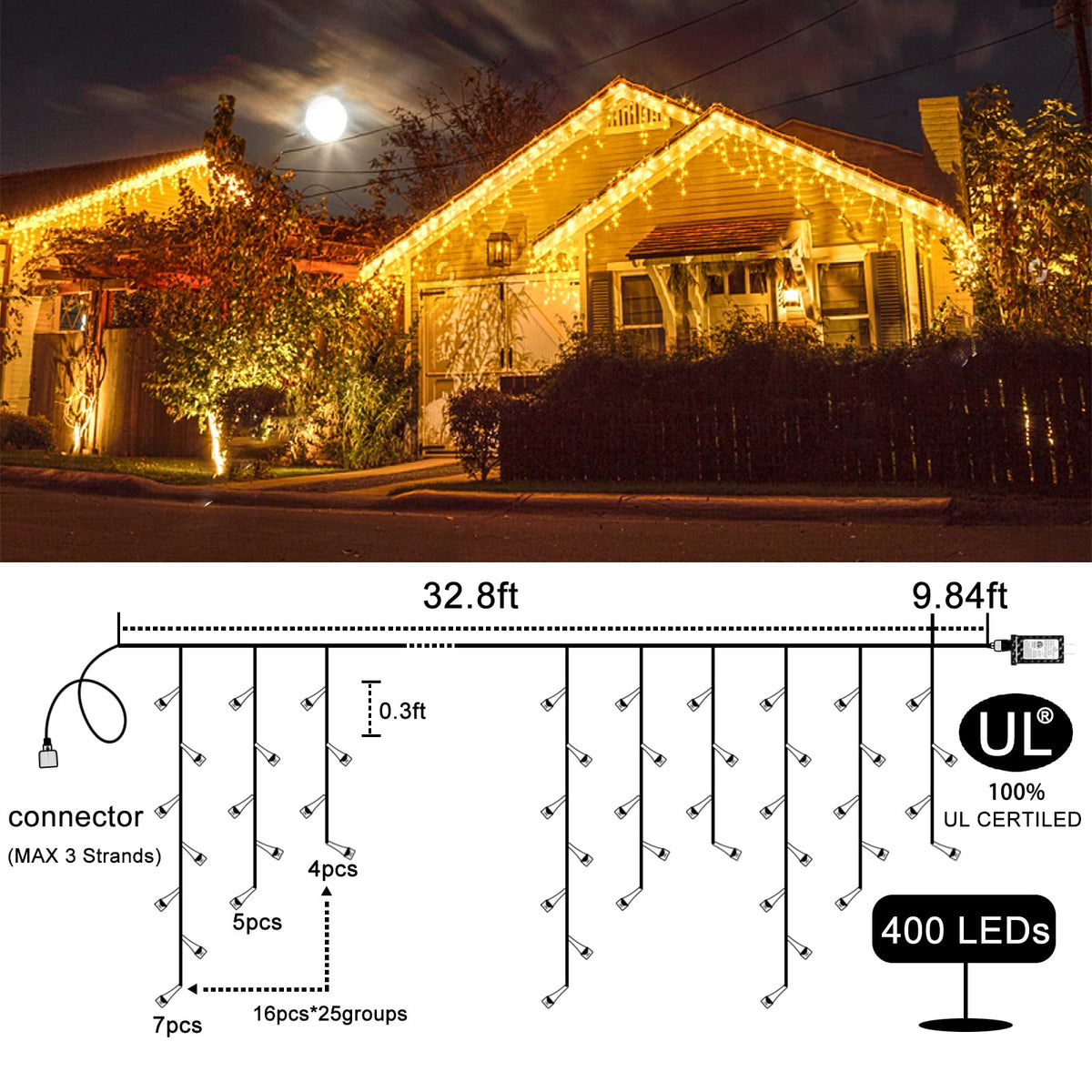 Icicle Christmas Lights Outdoor, 33Ft 400 Led Christmas Lights 8 Modes Waterproof With 75 Drops, Plug In Twinkle Fairy String Lights For House Indoor Party Holiday Wedding Decoration, Warm White