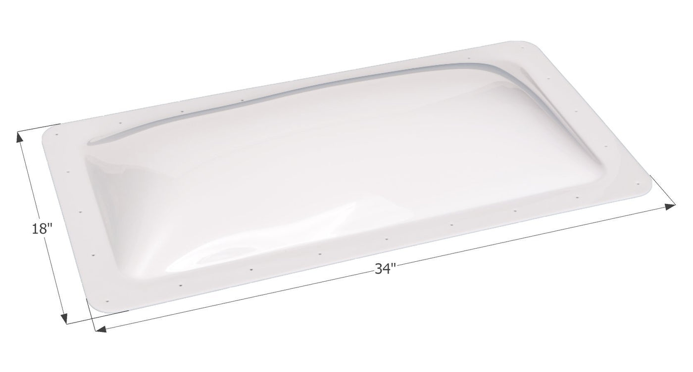 Q: What are the dimensions of the ICON 01849 RV Skylight?A: The ICON 01849 RV Skylight has dome dimensions of 30" x 14" x 4" and outer dimensions of 34" x 18".