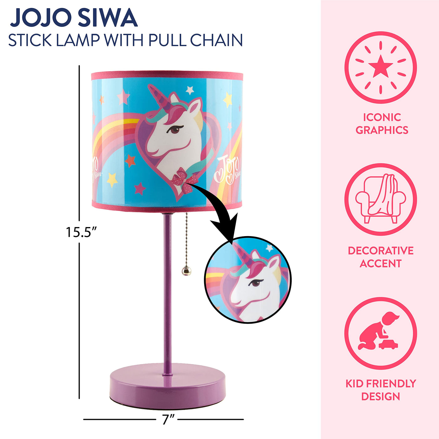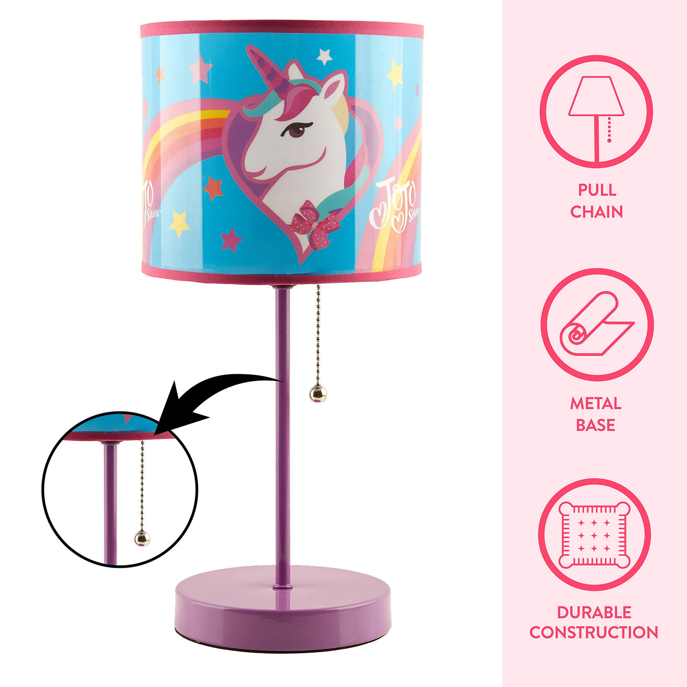 Idea Nuova Jojo Siwa Unicorn Stick Table Kids Lamp Metal With Pull Chain, Themed Printed Decorative Shade