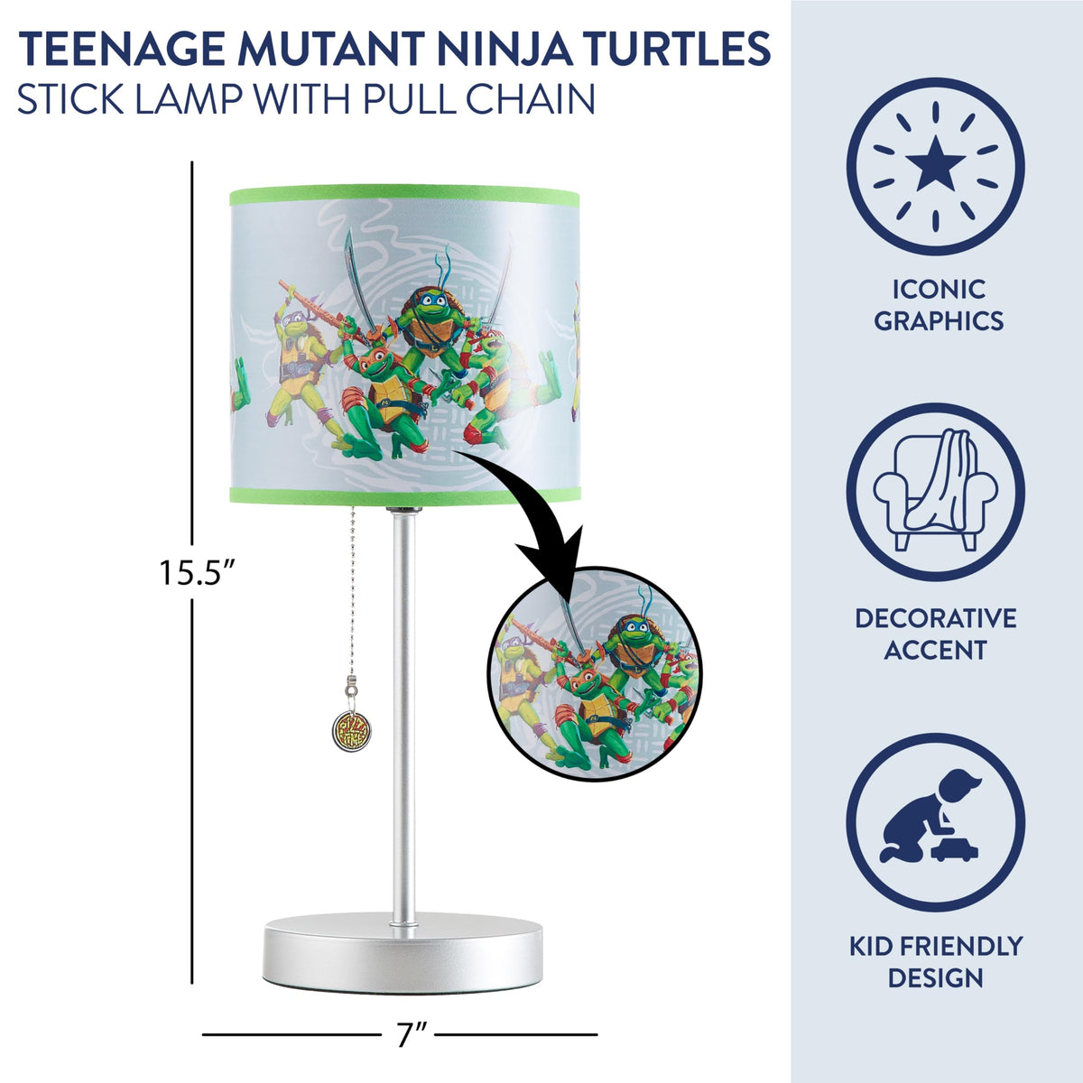 Q: What are the dimensions of the Teenage Mutant Ninja Turtle Stick Table Lamp?A: The Teenage Mutant Ninja Turtle Stick Table Lamp measures 15.5 inches in height and 7 inches in width, making it an ideal size for bedside tables, dressers, or desks.