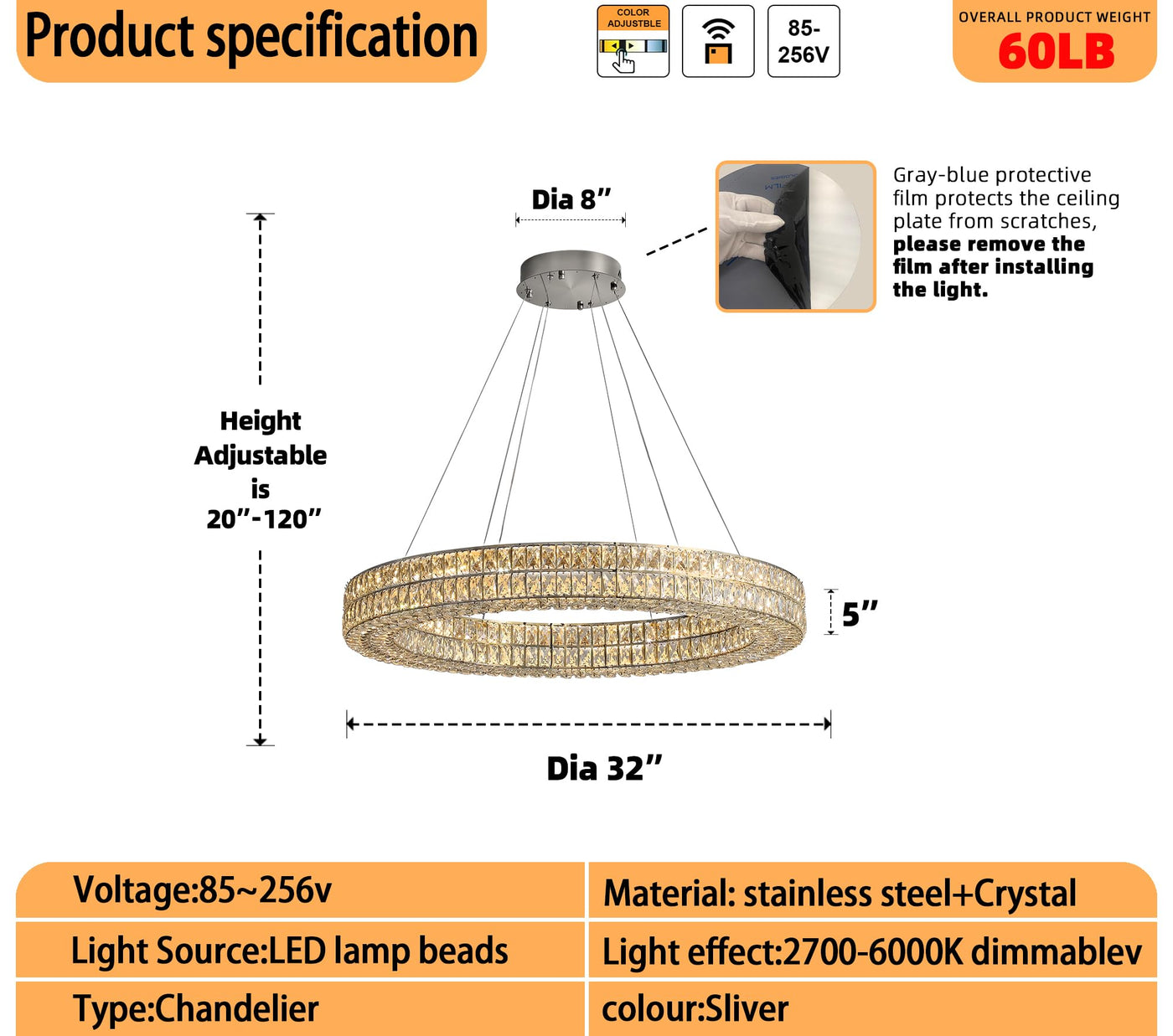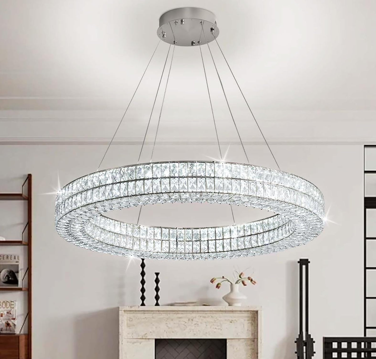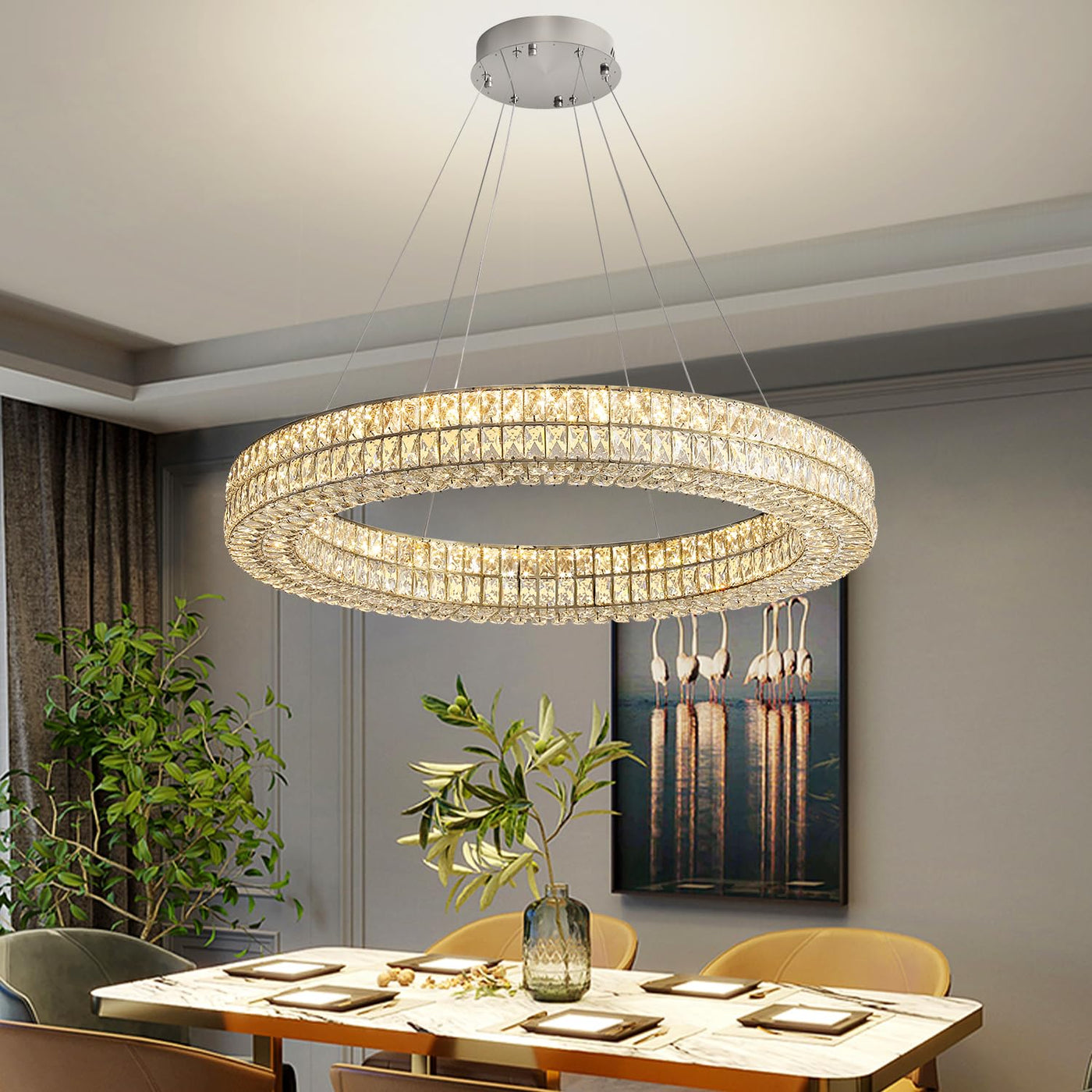 47.5 Inches Modern Led Dimmable Crystal Chandeliers Ring Chandeliers Adjustable Stainless Steel Ceiling Lights Rings Round Pendant Lighting for Living Room & Dining Room