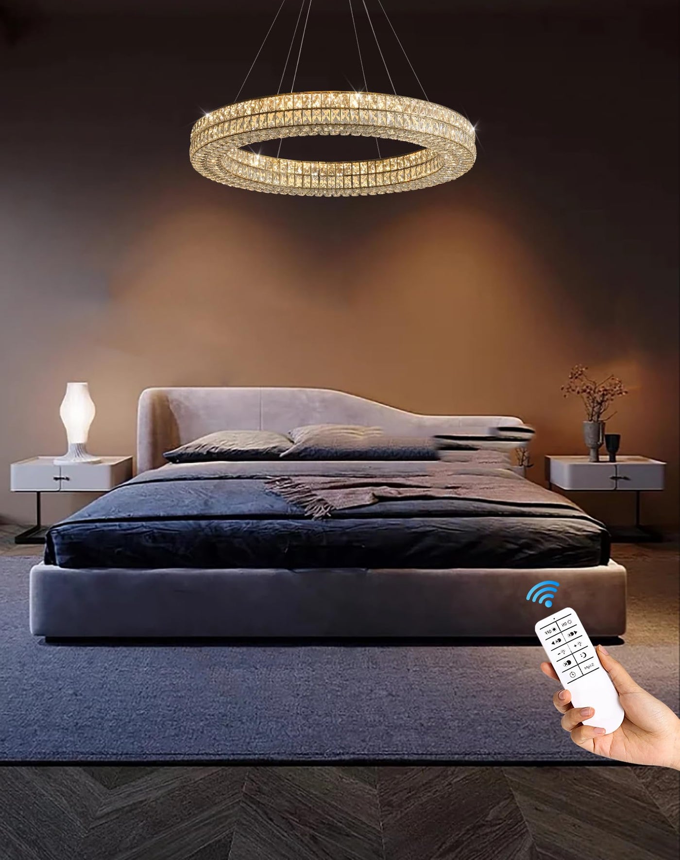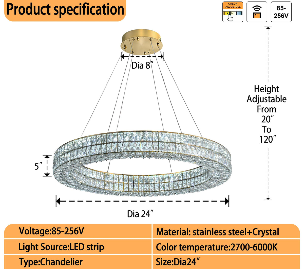Idequy Led 24'' Gold Ring Crystal Chandelier, Modern Dimmable Chandeliers Lighting And Hanging Adjustable, Led Round Ceiling Lig