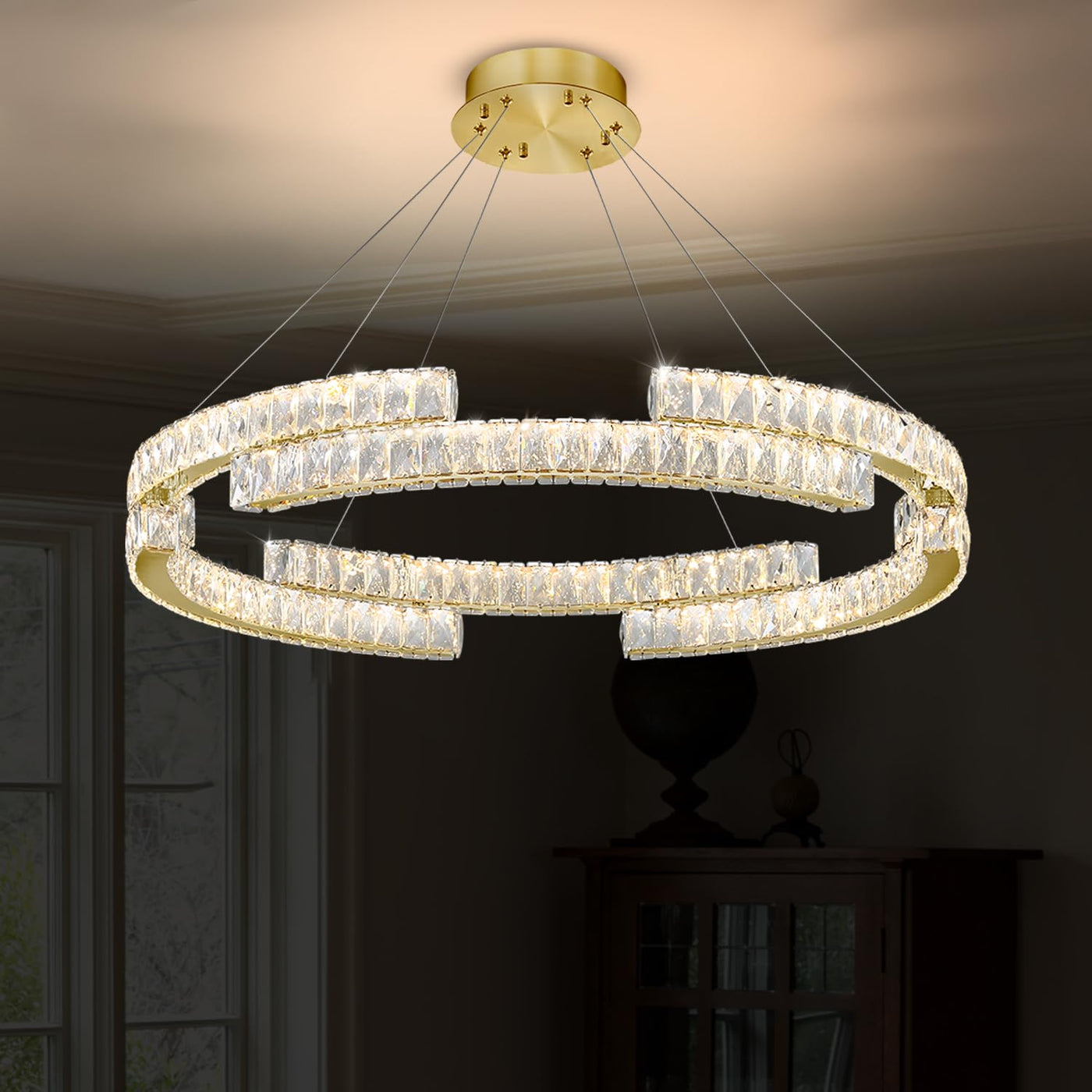 Crafted from well-made stainless steel and K9 crystal, this chandelier features a unique gold design that creates a beautiful refraction of light, resembling the brilliance of diamonds. The adjustable pendant wire allows for customization of height, ensuring it fits perfectly in various ceiling spaces. With a dimmable function, you can easily adjust the lighting from a warm 3000K to a bright 6000K, making it suitable for any occasion or mood.