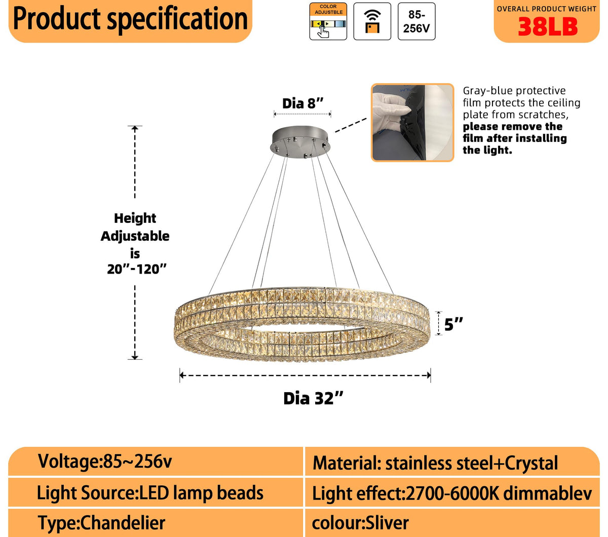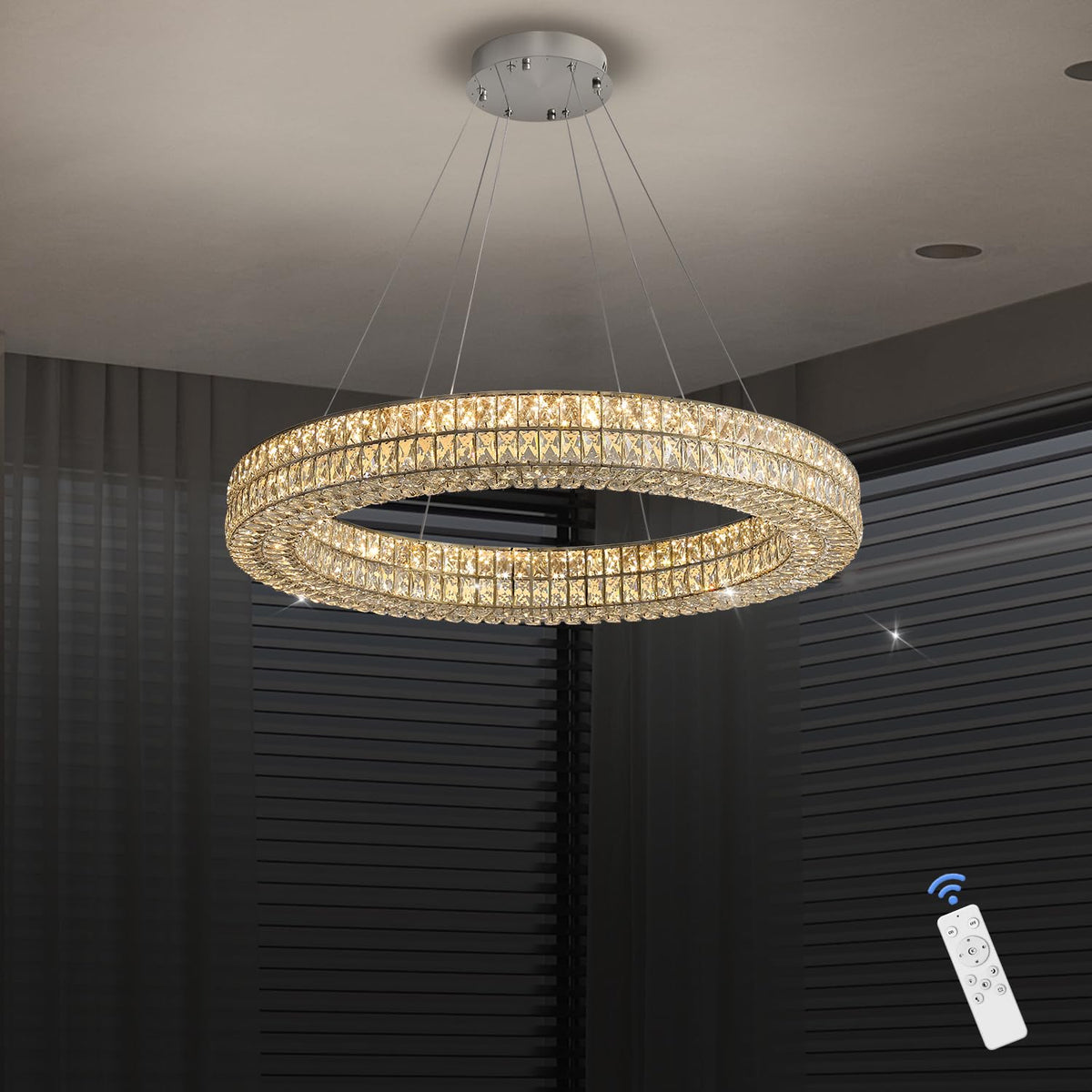 Modern Crystal Chandelier for Dining Room Luxury Silver Crystal Chandelier for Living Room Dimmable LED 32'' Ring Pendant Light Adjustable Dimmable 2700k-6000k
